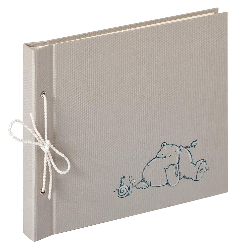 En søt liten person krever et minst like søtt fotoalbum! Her har vi et stilrent babyalbum som er kledd i grå tekstil og dekorert med en hvit sløyfe som går gjennom sølvfargede maljer. På forsiden er det et koselig motiv i form av en liten flodhest som vrikker på rompa og en snegle med en blomst på skallet. På hver siden finnes samme fine flodhest inntill 4 linjer hvor du kan skrive noe passende.