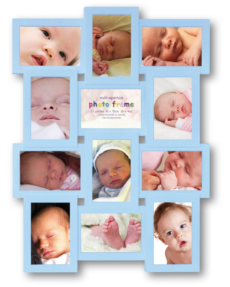 Med Maggiore XV Blå får du en søt collageramme med plass til hele 12 bilder i både liggende og stående format. Et utmerket valg for å minnes ditt barns første tid.