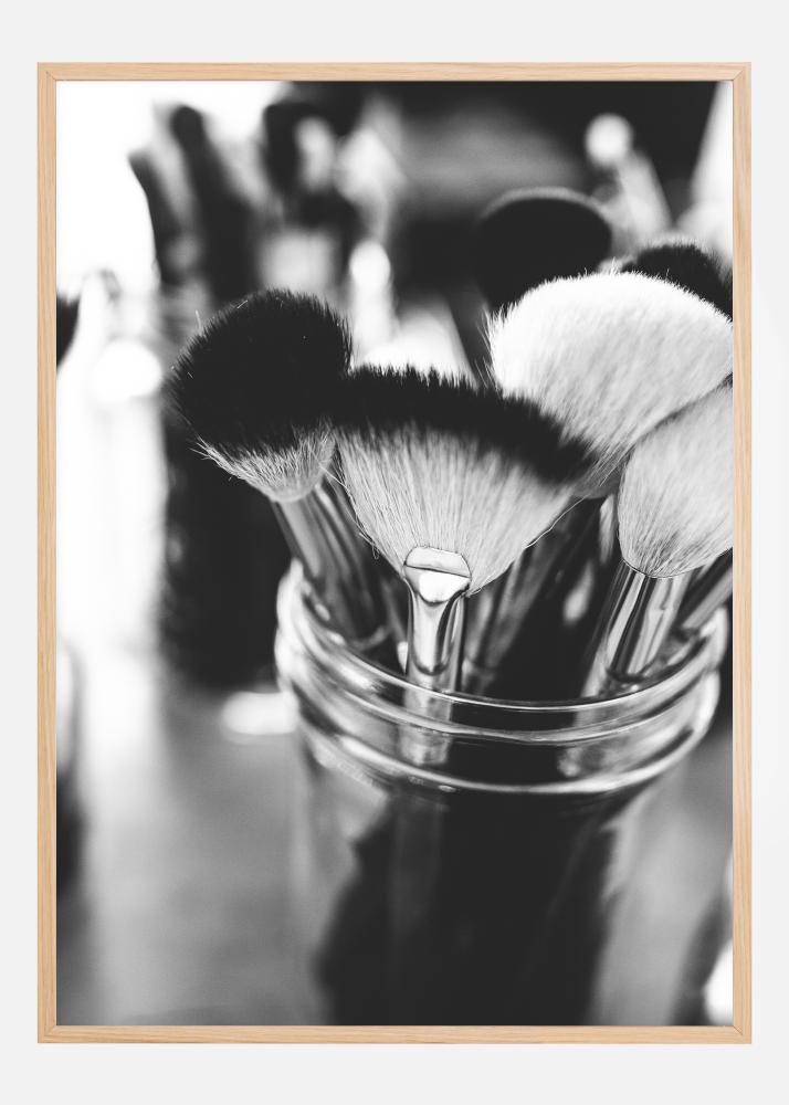 En kunstnerisk, men likevel morsom plakat med en glasskrukke full av sminkebørster. Dette slående svart-hvitt-bildet viser en rekke børster i ulike størrelser. Føl børstenes mykhet når du henger denne plakaten på soverommet ditt.