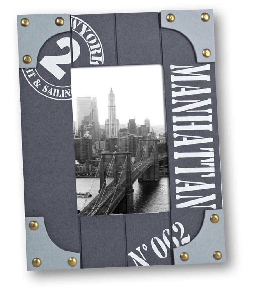 Retroinspirert bilderamme med mørk grå bakgrunn som tydelig refererer til New York og Manhatten. Rammen har et unikt design med opphøyde lyse grå hjørner pyntet med fine messingnagler.