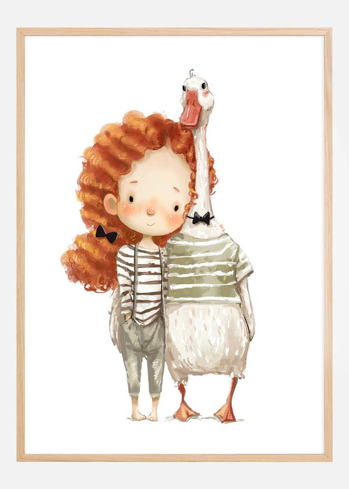 Denne lekne og hjertvarme plakaten skildrer en ung jente med livlige, røde krøller, stående ved siden av hennes trofaste følgesvenn, en stor and. De deler et ømt og gledelig øyeblikk sammen, som er fanget i de myke, varme tonene av akvarellmaleriet. Den sjarmerende duoen, med jentas rødmende kinn og andens nysgjerrige blikk, utstråler vennskap og glede.