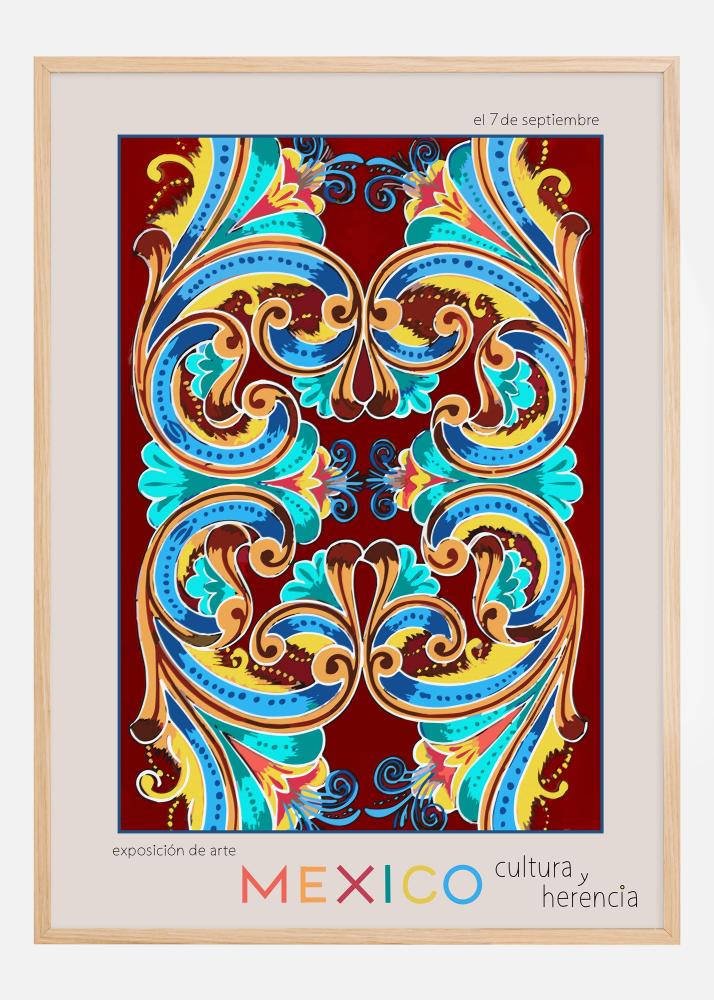Plakaten er en hyllest til Mexicos rike kulturelle landskap, og hver detalj i illustrasjonen er nøye utformet for å feire landets kunstneriske tradisjoner. Den enkle eikerammen kompletterer de varme fargene og gjør kunstverket til en ideell tillegg i alle rom som verdsetter kulturelt mangfold og kunstnerisk energi. Denne plakaten er ikke bare en invitasjon til en kunstutstilling, men også en invitasjon til å oppleve og verdsette Mexicos unike estetikk og ånd.