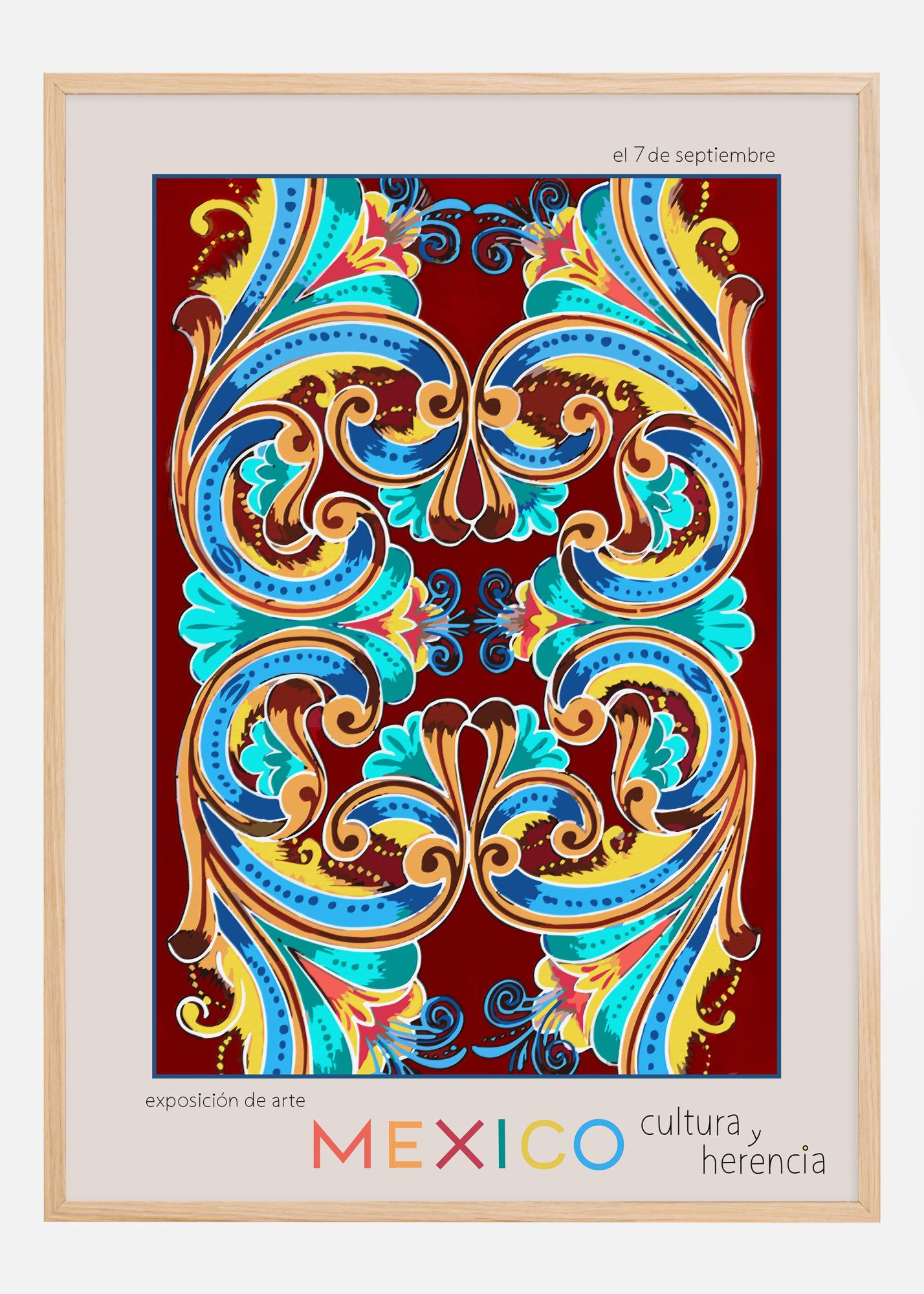Denne livlige og fargerike plakaten feirer en kunstutstilling i Mexico. Designen er inspirert av tradisjonelle meksikanske mønstre, full av svingende kurver og eksuberante blomster motiver som inviterer øyet til å danse over bildet. De rike røde, gule og blå fargene er typiske for meksikansk folkekunst og symboliserer nasjonens kultur og arv med en moderne vri.
