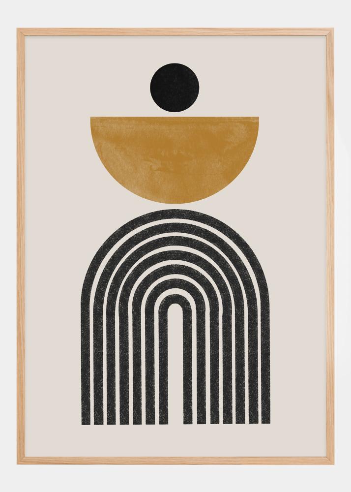 Fordyp deg i en verden av abstraksjon og symmetri med vår moderne plakat som fremstiller en serie svart-hvite buer under en solformet gullduftende halvsirkel, toppet av en svart sirkel. Denne trykket er en ode til den moderne kunstens klarhet og den geometriske designens enkelhet, noe som gir en sofistikert touch til din innredning. Fargene er dristig redusert for å fremheve kontrasten og den visuelle tyngden i hver form.