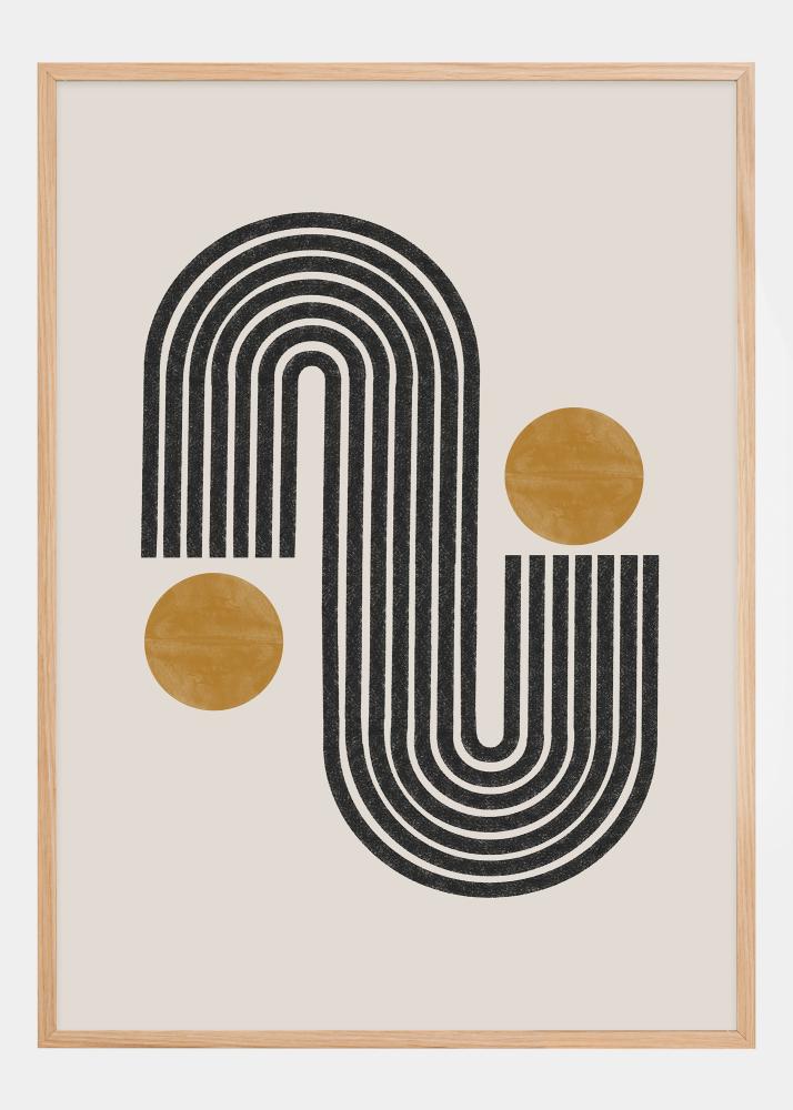 Oppdag en verden av stilren skjønnhet med vår plakat som fremhever kontraster gjennom både form og farge. Dette trykket viser et dynamisk svart-hvitt mønster av linjer som danner en mykt svingende form, balansert med to okkerfargede sirkler som gir en varm og jordnær følelse. Denne minimalistiske men effektfulle designen er inspirert av mid-century moderne estetikk og tilbyr en følelse av ro og balanse i hvert rom den plasseres i.