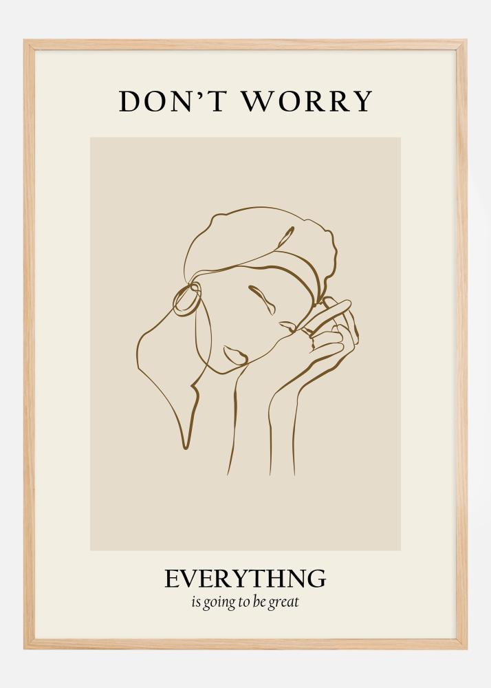 Denne kunstneriske plakaten fanger et rolig øyeblikk av refleksjon og indre fred gjennom en linjetegning av en person som holder hånden mot ansiktet. Teksten "DON'T WORRY" i store bokstaver overskrider bildet og gir en beroligende påminnelse, mens "EVERYTHING is going to be great" understreker budskapet med en mer ettertenksom tone. Dette moderne kunstverket er perfekt for å skape en følelse av ro og optimisme hjemme eller på kontoret.