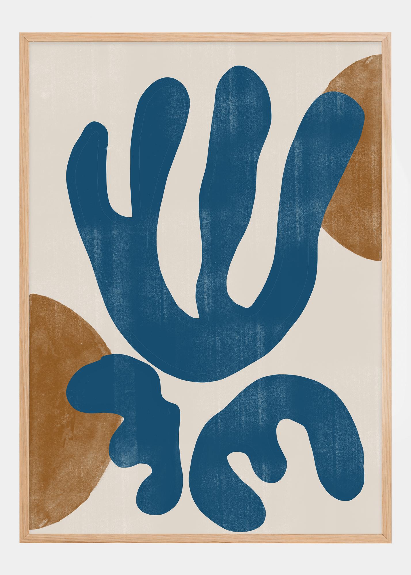 Denne livlige plakaten kombinerer dristige former og en jordnær fargepalett for å skape en følelse av både moderne kunst og naturens underverker. De store, svepende blå formene fremkaller tanker om vann eller vegetasjon, mens de okergule detaljene bidrar med en varm og naturlig kontrast. Dette designet er et utmerket eksempel på hvordan abstrakt kunst kan etterligne og hylle de organiske mønstrene i vår omverden.