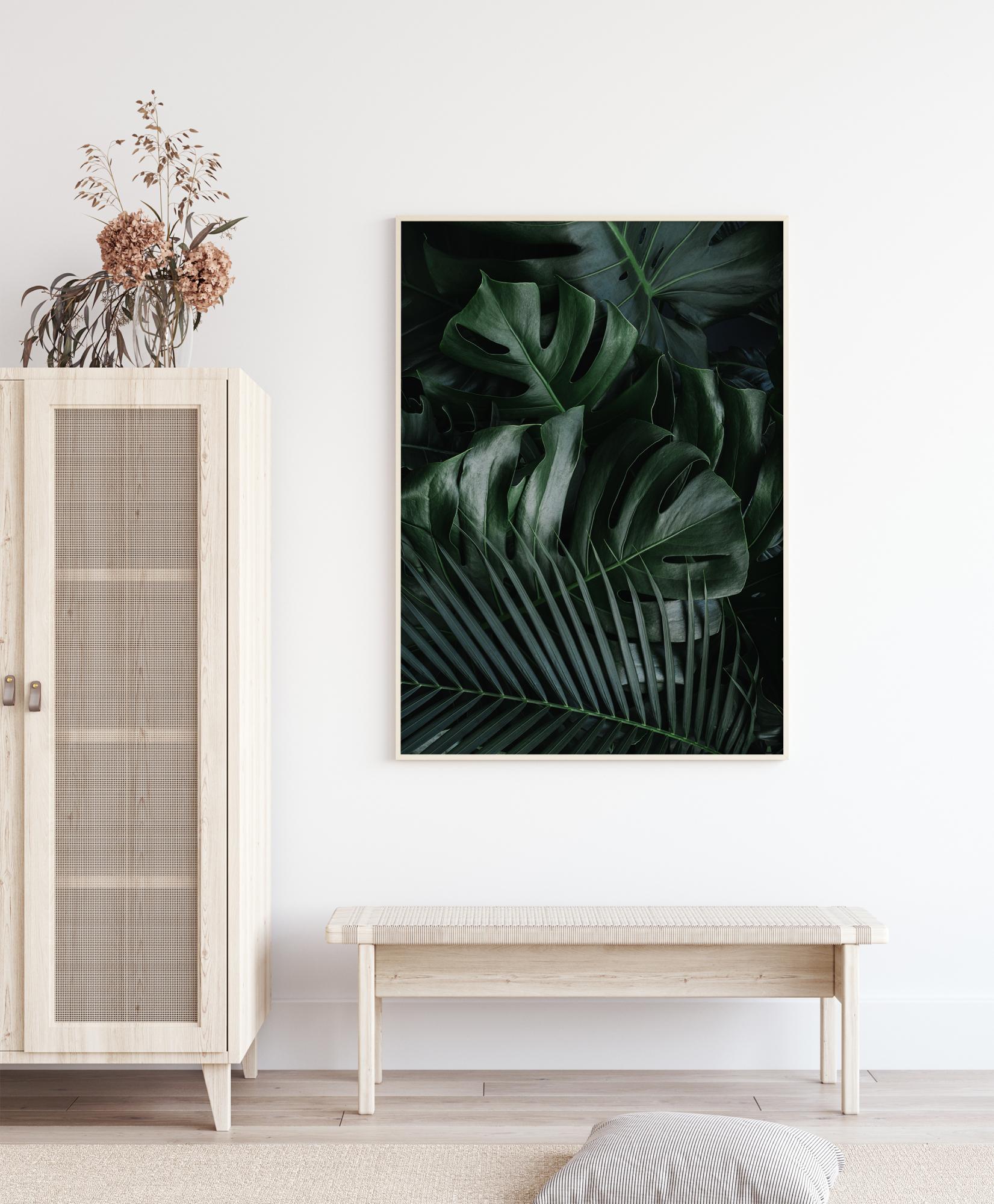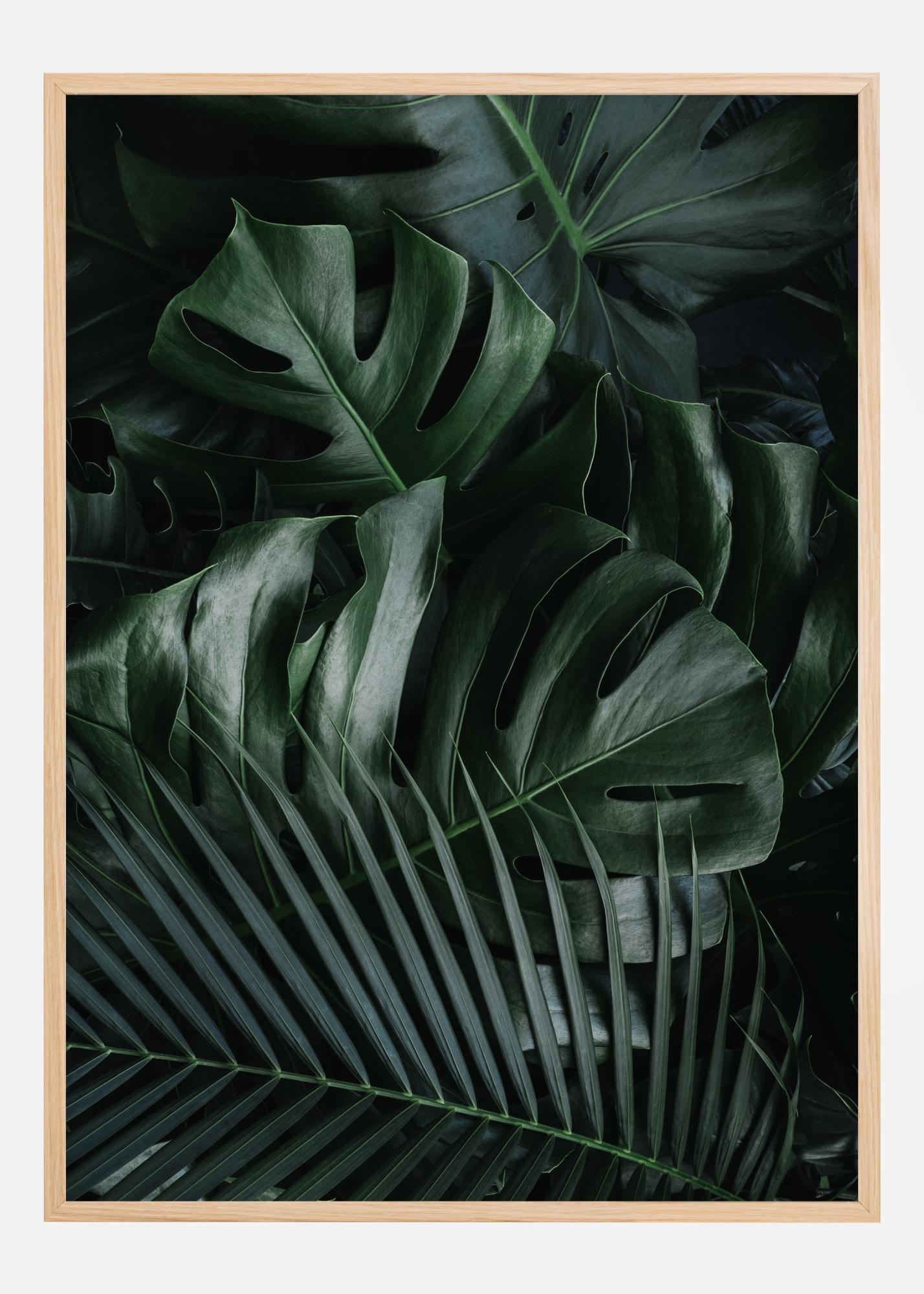 Et grønt portrett av grønne monstera- og palmeblader. Det naturlige lyset skinner på den øverste delen av monstera-bladene som skaper mørkere nyanser i den øvre delen av plakaten. Hele sagformede blader skaper en varm og avslappende følelse. En perfekt plakat for alle som elsker planter.