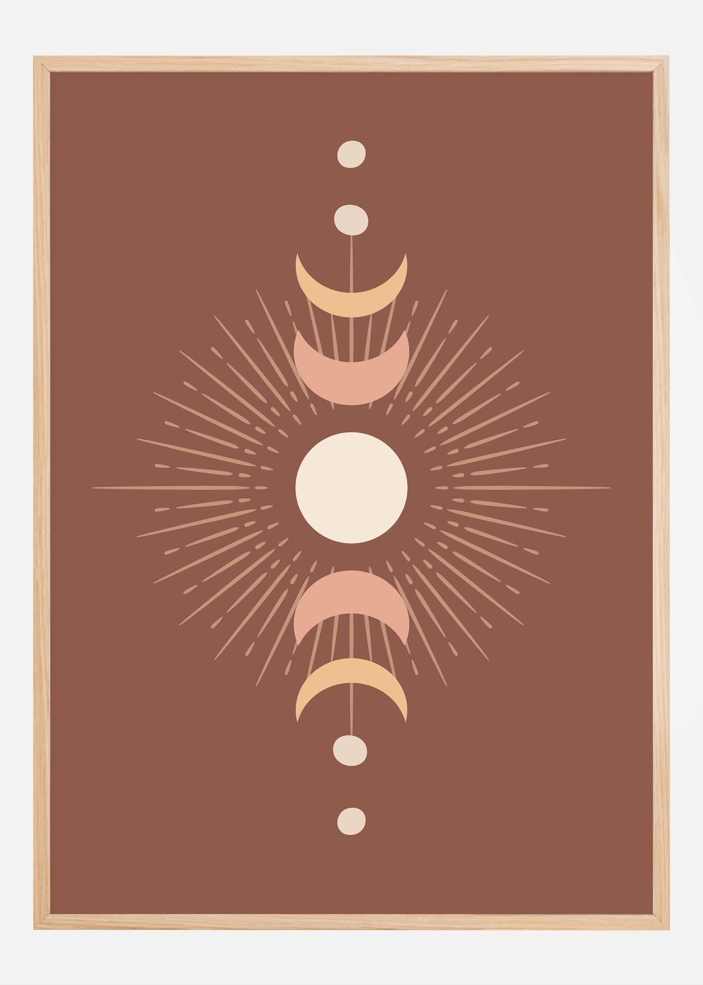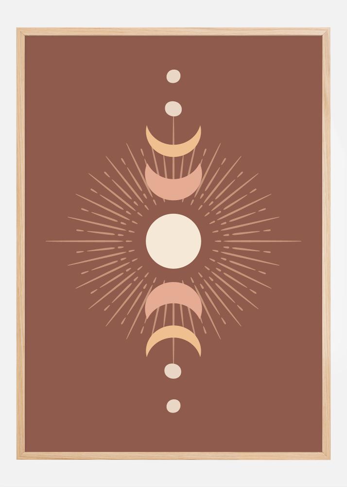 Denne stilige plakaten, som skildrer månens forskjellige faser mot en dyp og tankevekkende bakgrunn, gir en følelse av kosmisk harmoni og tidløs skjønnhet. De forsiktig linjerte månefasene, sentralt arrangert med den strålende solen nedenfor, er en påminnelse om vår plass i den større sammenhengen av universet. Dens varme fargepalett i jordtoner skaper en beroligende og innbydende atmosfære.