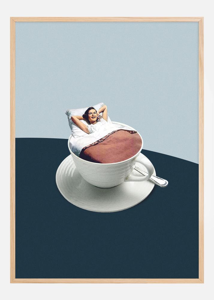 Denne originale og fantasifulle plakaten portretterer en kvinne som ser ut til å nyte et avslappet øyeblikk i et uvanlig miljø: hun ligger komfortabelt i en hvit kopp fylt med kaffe, omgitt av et beroligende blått rom som antyder morgengry. Koppens størrelse i forhold til kvinnen skaper en surrealistisk følelse, og hennes avslappede holdning i sengetøy tilfører en touch av hverdagskomfort og humor til scenen.