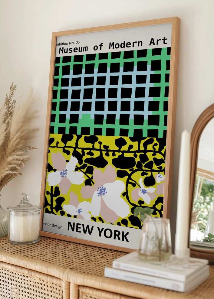 I den nedre delen av plakaten dominerer et sprakende mønster i Gul med innslag av Svart, Hvit og Rosa. Blomstermønsteret tilfører en organisk kontrast til det geometriske rutenettet over. Ved å presentere en harmonisk miks av disse fargene og formene, blir denne printen et perfekt valg for å dekorere veggene i ethvert moderne hjem på en livlig måte.