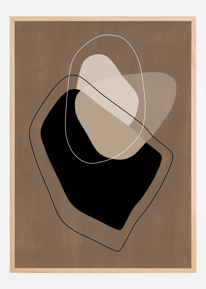 Denne plakaten forener den estetiske klarheten i geometrisk abstraksjon med en varm og innbydende fargepalett. Den presenterer en kreativ samhandling mellom mørke og lyse nyanser, der dristige svarte former står i kontrast til myke hvite linjer og beige og taupefargede felt. Denne konstellasjonen av elementer er omsluttet av en tynn, hvit omkrets som skaper en illusjon av rom og dybde. Denne plakaten er perfekt for den som setter pris på moderne design og søker et kunstverk som smelter sammen kontrasterende farger og former på en måte som er både tankevekkende og estetisk tiltalende.