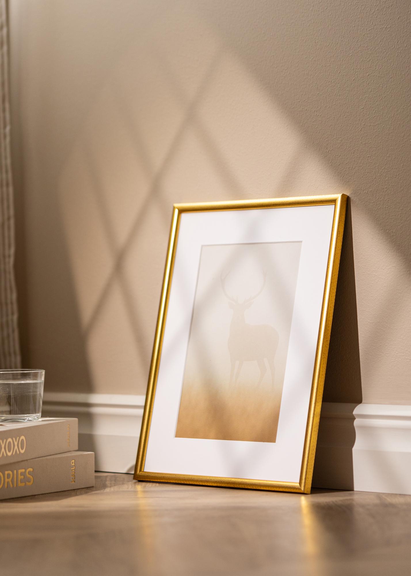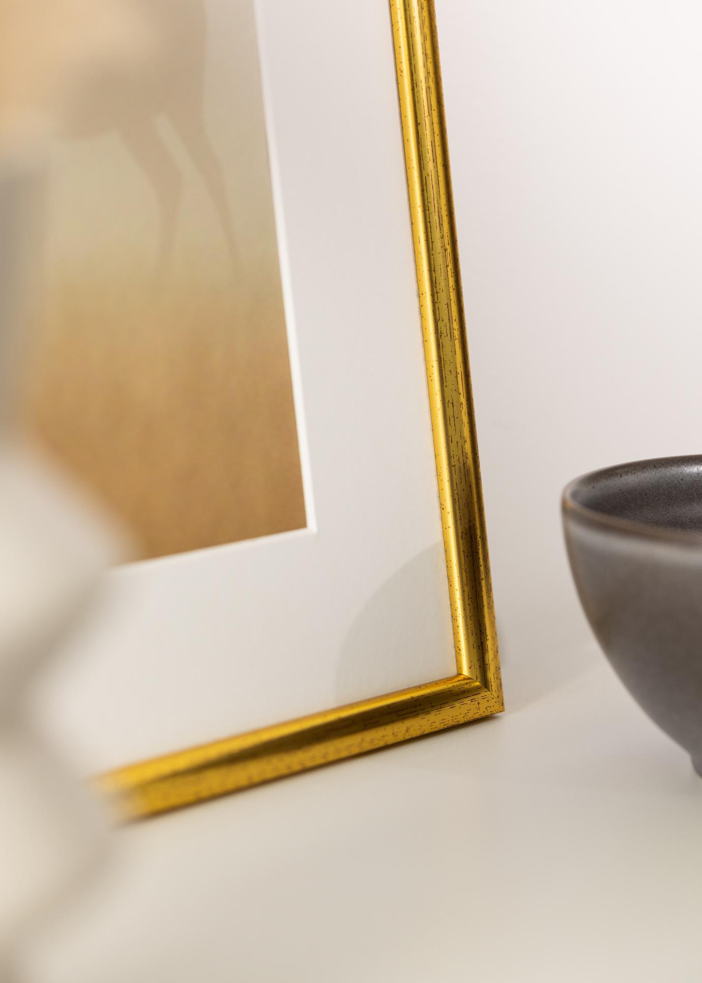 Start rammevelgeren »Newline Gull har en tynn rammeprofil (15 mm) som gir fokus til motivet i rammen. Rammen har en rødspettet gullprofil som gir et gammeldags utseende.