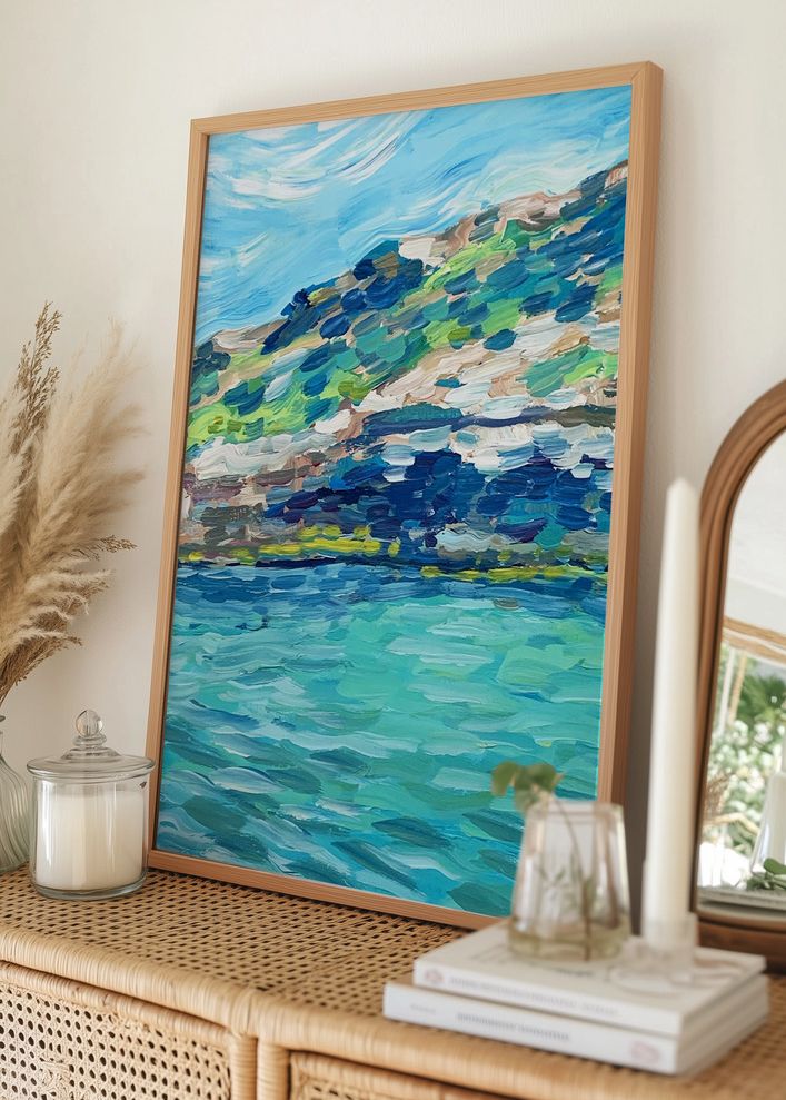 Dette livlige trykket fanger essensen av en rolig kystlinje med sine sveipende penselstrøk. De turkise og asurblå nyansene i vannet speiler en klar og fredelig dag ved havet. Fjellet i bakgrunnen er malt med en palett av grønne, blå og jordnære toner, noe som skaper en harmonisk kontrast mot den klarblå himmelen.