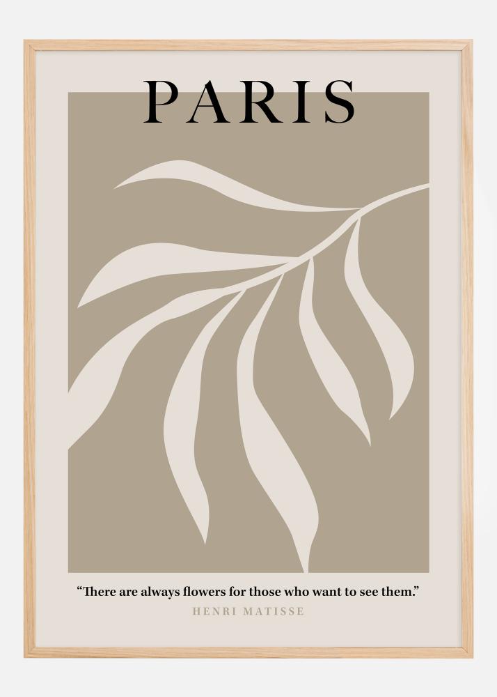 Denne elegante og stilrene posteren hyller Paris, byen som har inspirert så mange kunstnere og poeter. Dens enkle men kraftfulle design består av hvite linjer som formerer en abstrakt flora, mot en enhetlig beige bakgrunn. Teksten "PARIS" er pent plassert øverst, noe som gir en direkte assosiasjon til byens klasse og tidløshet. Nederst er et sitat av Henri Matisse, "There are always flowers for those who want to see them.", som legger til et lag av dybde og ettertanke i denne allerede betydningsfulle plakaten.