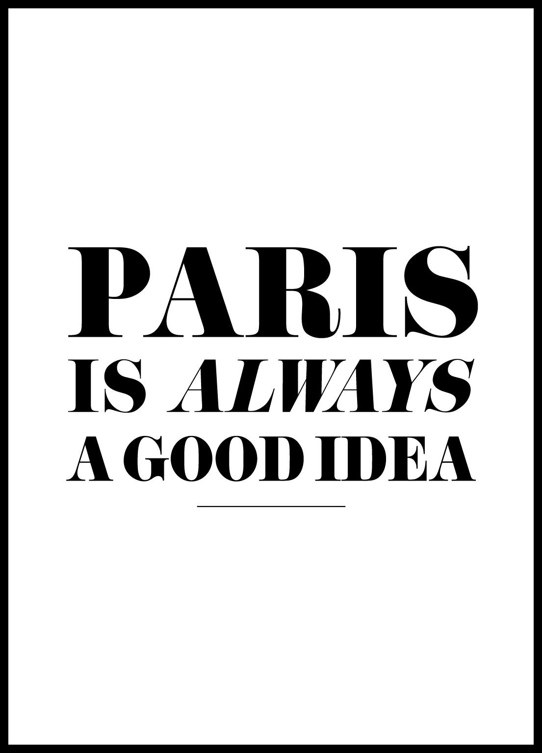 Regnet slår mot kontorvinduet og teksten på datamaskinen flyter sammen til en svart masse. Det prikker i kroppen av kjedsomhet og hverken kaffe eller en benstrekk hjelper. Men så kaster du et blikk på det lille bildet på skrivebordet og den irriterende følelsen endres til drømmer. Du kan alltid ta en langhelg til Paris! Denne herlige printen har teksten ”Paris is always a good idea” trykket med svarte versaler mot en hvit bakgrunn. Sett den opp som den er eller kompletter med noen av våre høykvalitets rammer. Finnes i ulike format, så du kan være sikker på at du finner den størrelsen du vil ha.