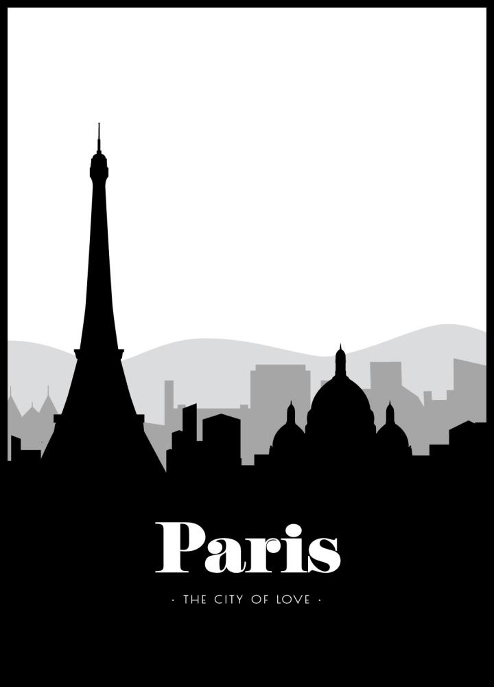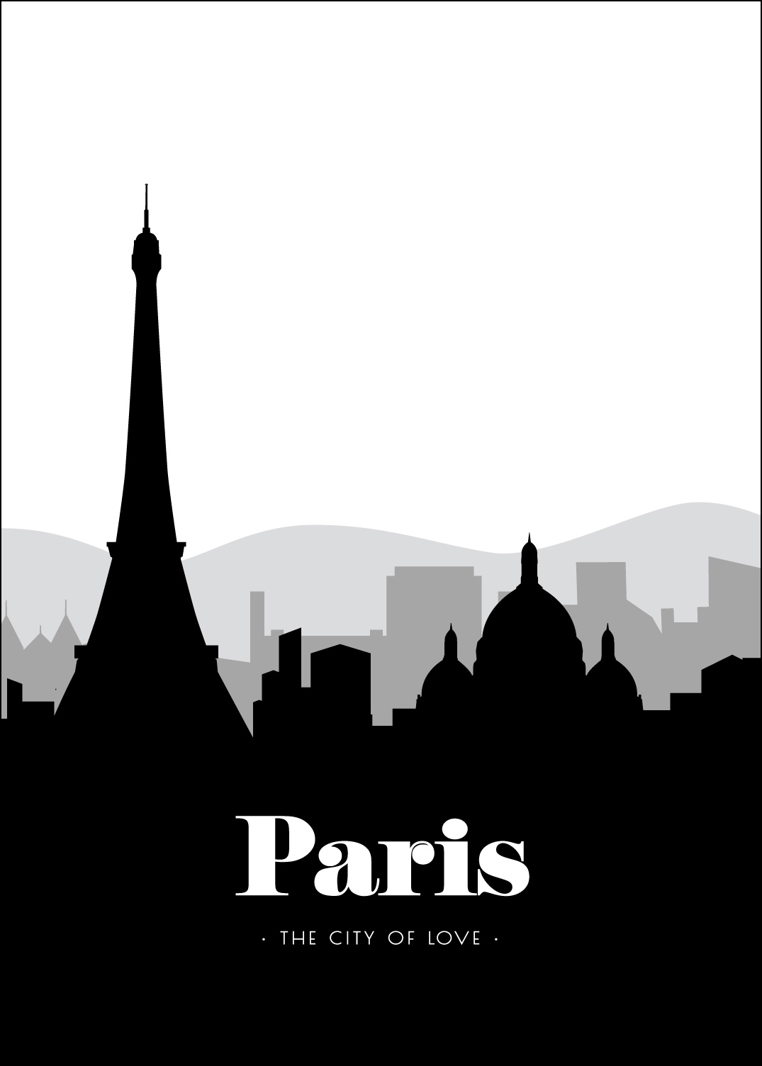 Gjør stuen mer spennende med grafiske print i ulike utførelser! Denne lekre posteren forestiller Paris i tre ulike silhuetter. I bakgrunnen finnes et lysegrått og bølgende landskap, i midten ser du grå bygninger og i den svarte forgrunnen kan du skimte blant annet Sacré-Cœur och Eiffeltårnet. Mot det svarte finnes teksten "Paris, The city of love" trykket i hvitt. Kompletter med en svart eller hvit ramme fra vårt store sortiment. Ettersom designet går i gråskala funker den også utmerket sammen med en fargerik ramme. Paris Skyline finnes i flere ulike størrelser, så du kan være sikker på at du finner en som passer din bruk.