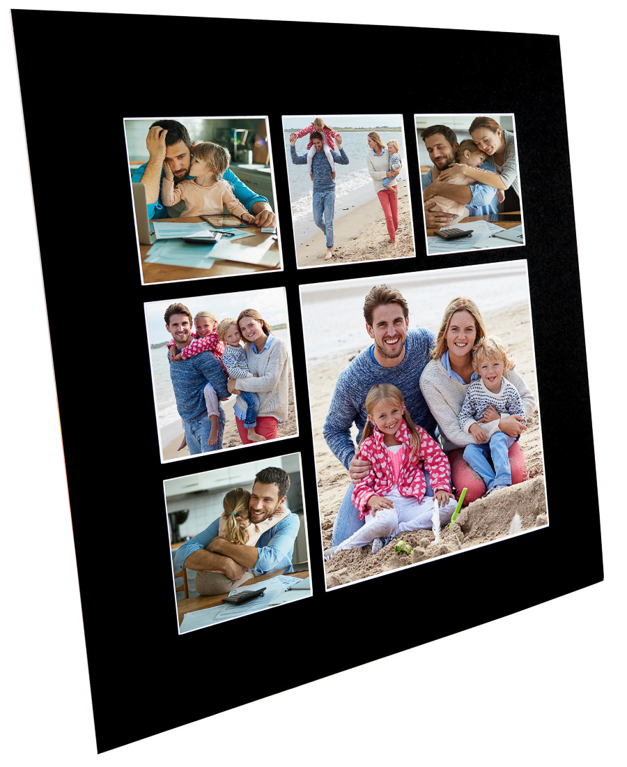 Svart collagepassepartout i høy kvalitet fra markedsledende Canson. Cansons passepartouter er laget i syrefritt materiale og er PH-nøytral, noe som er viktig for lang holdbarhet. Skråkantene innerst mot bildene er hvite.