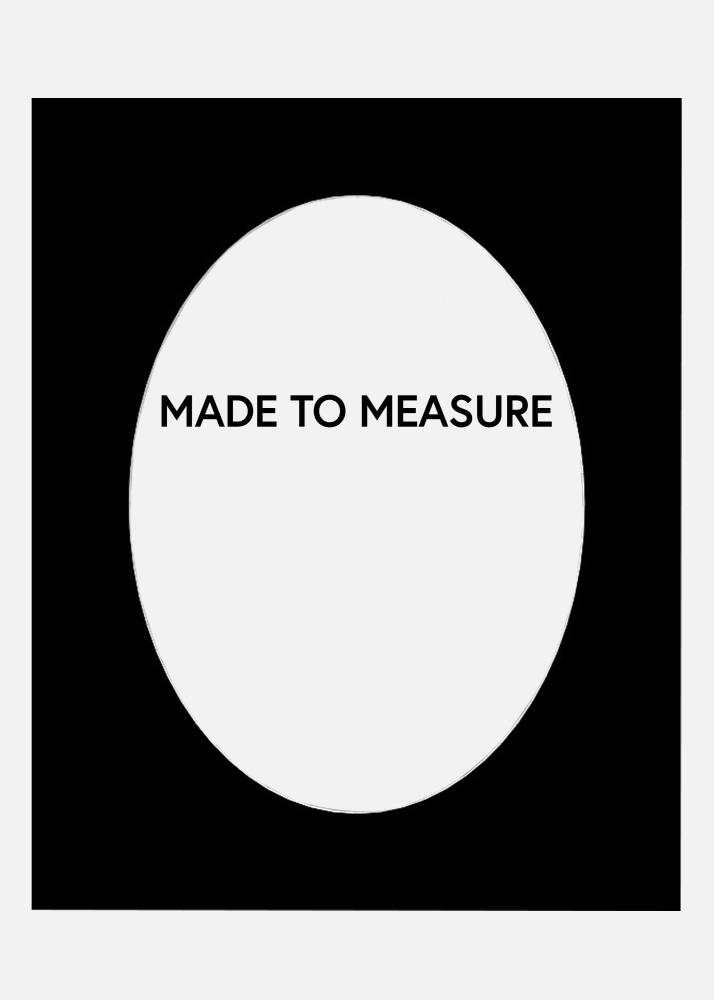 Svart oval eller rund passepartout i dine egne mål med hvit kant skåret i 45-graders vinkel nærmest motivet. Et godt valg til portretter i klassisk stil.