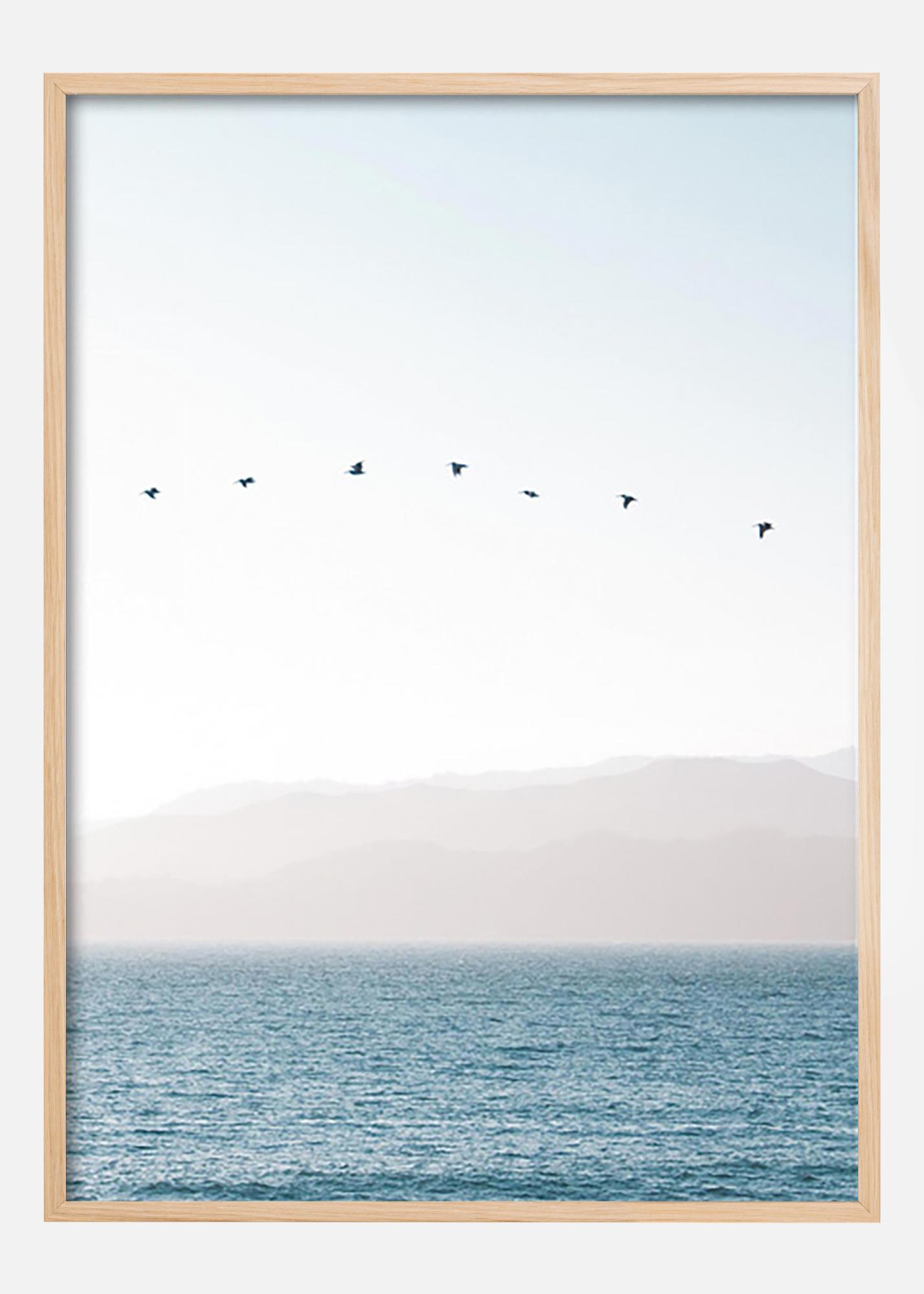 Et vakkert naturfotografi av fugler som svever over blått vann mot en bakgrunn av fjerne fjell og en hvit himmel. En fredelig og harmonisk poster i kjølige toner som passer like godt på badet som i soverommet eller stuen.
