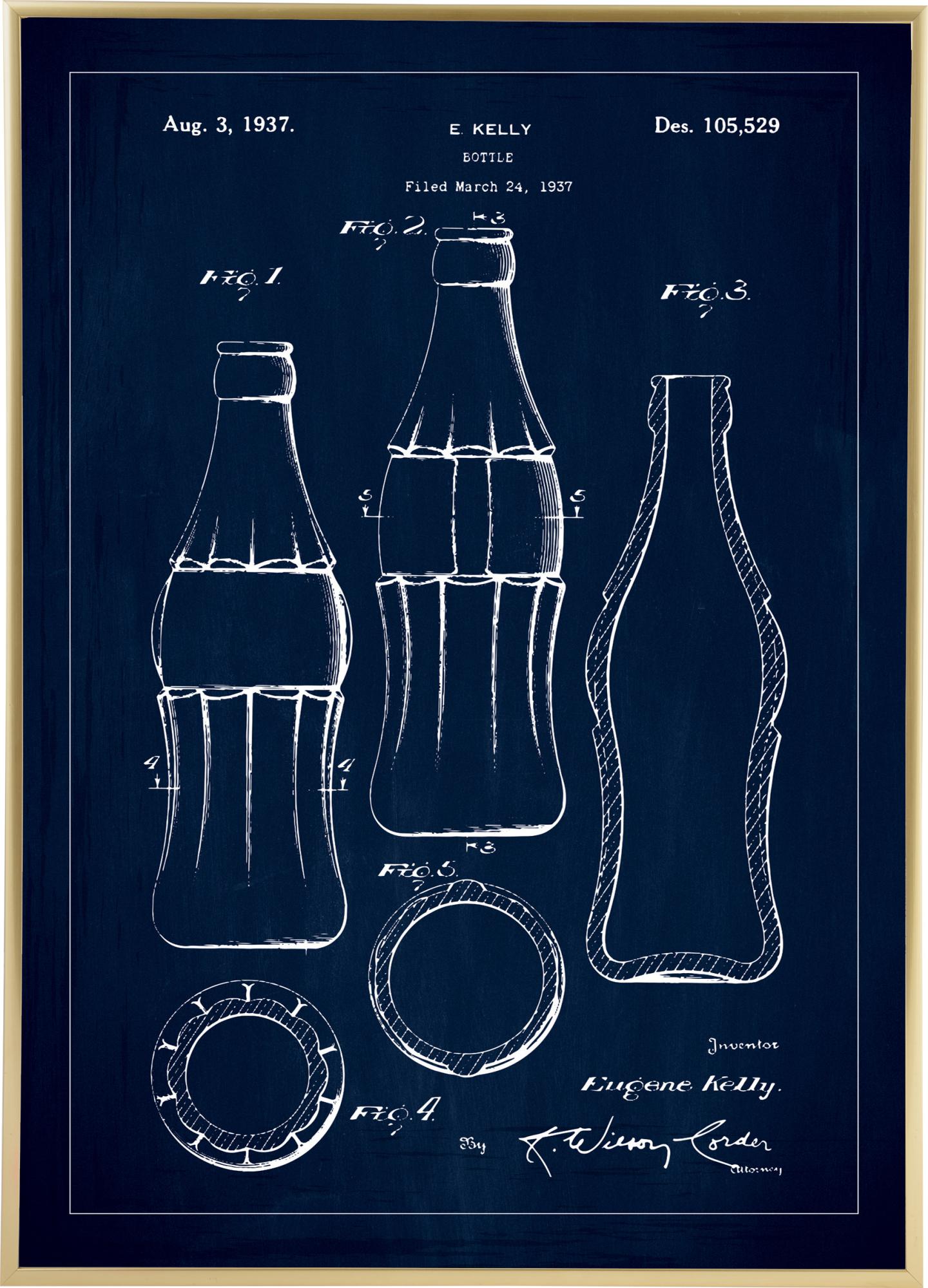 Pynt veggen med en fin patenttegning av den berømte Coca Cola flasken! Denne plakaten blir garantert et fint innlag i interiøret, spesielt om du har diverse retroting å matche med. Tegningen viser flasken i flere ulike vinkler. Øverst kan du se at den ble levert inn 24.mars 1937, at patentet ble godkjent 3.august samme år og hvilket nummer det ble tildelt. Nederst finner du formgiveren Eugene Kellys navn samt underskriften til en advokat. Rundt motivet er det en tynn linje.