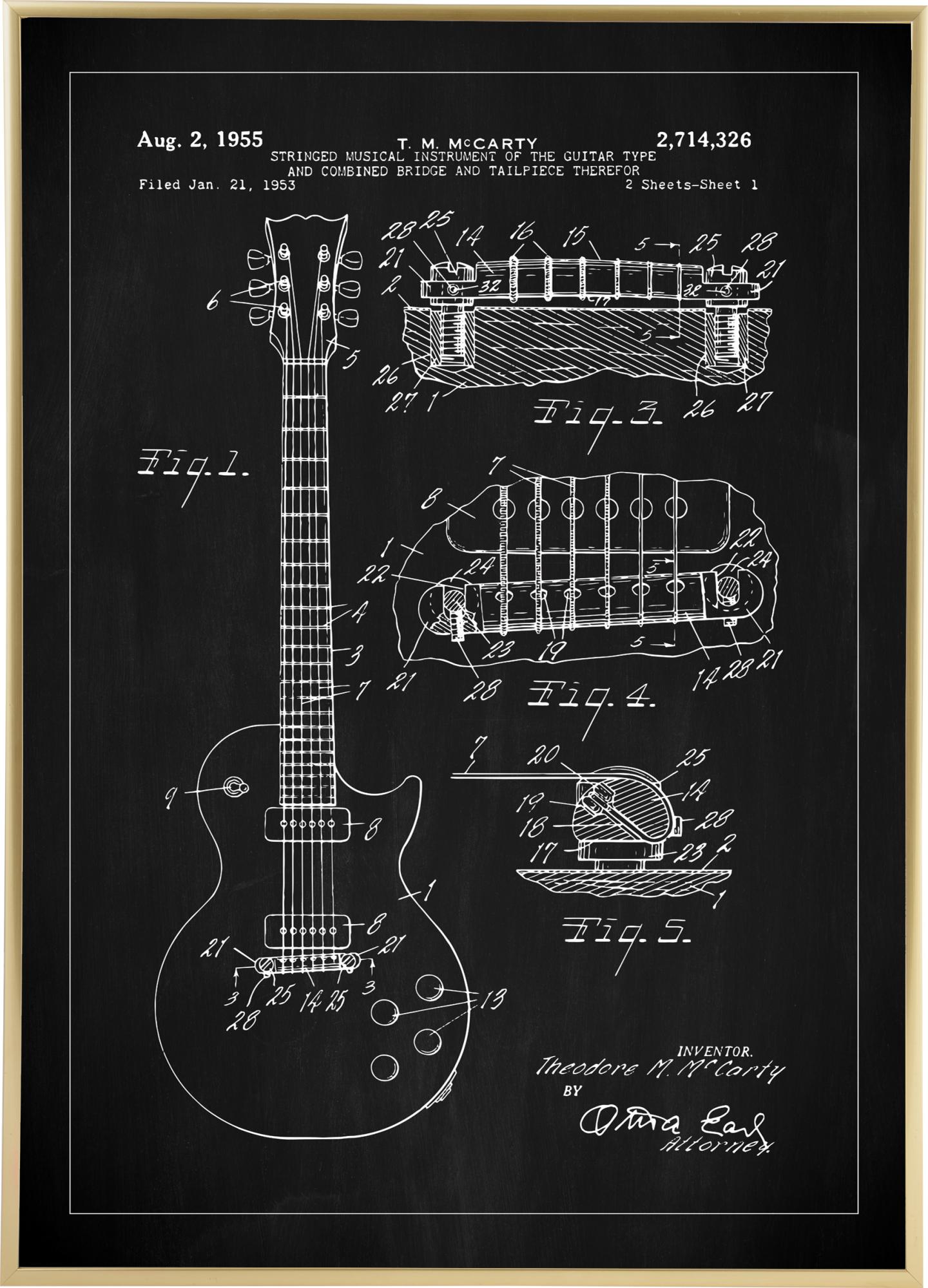 Heng en detaljert patenttegning som viser en Gibsom på veggen og imponer alle dine musikkinteresserte venner! Denne eksklusive plakaten er en kopi av Ted McCartys originaltegninger som han leverte inn 21.januar 1953, noe du kan se øverst. Du kan også lese at patentet ble godkjent 2.august 1955 og hvilket patentnummer det fikk. Nederst står Theodore McCartys navn samt en underskrift av en advokat. Tegningen viser elgitarens ulike deler med nøye utførte detaljer. Rundt motivet løper en symmetrisk linje. Ettersom plakaten finnes i flere ulike størrelser finner du enkelt en som passer til akkurat ditt formål. Kompletter gjerne med en stilig ramme fra vårt store utvalg!