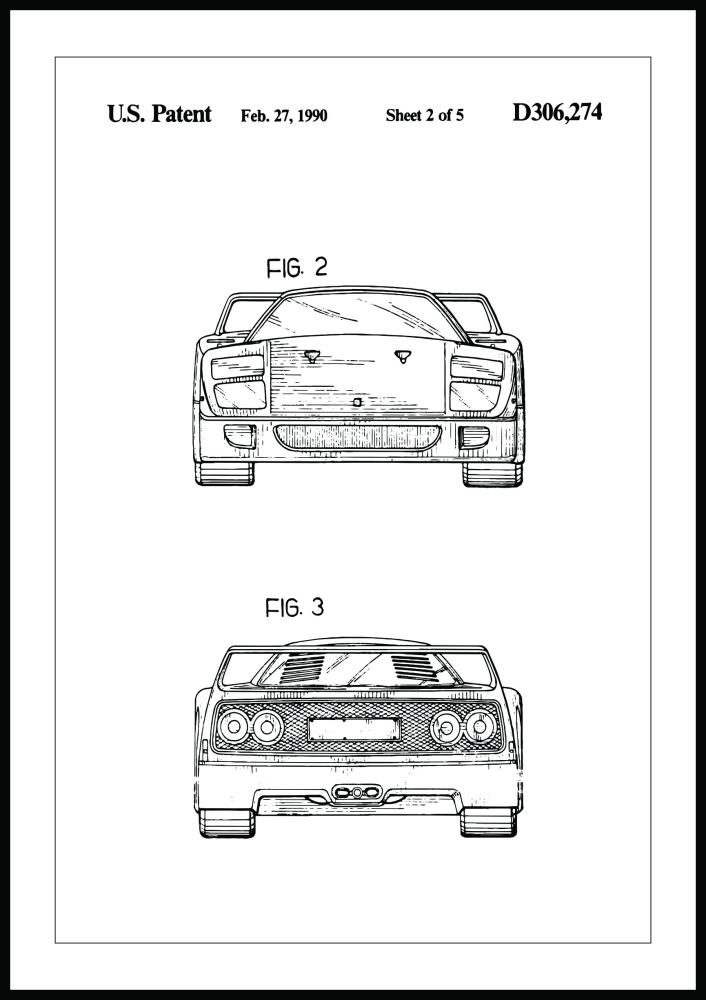 Skulle du mer enn gjerne suse omkring på veiene i en kul Ferrari F40? Nå kan du i alle fall imponere med å henge denne kule patenttegningen på veggen! Posteren viser den raske bilmodellen fra 2 vinkler og øverst finner du teksten til patentet. Du kan blant annet lese at søknaden ble levert inn av ingeniøren Leonardo Fioravanti i desember 1987, at patentet ble bevilget i februar 1990 og hvilket patentnummer det fikk. Rundt motivet går en svart linje. Ettersom posteren finnes i en rekke ulike størrelser finner du enkelt en som passer akkurat din vegg. Velg gjerne en lekker ramme til fra vårt store utvalg!