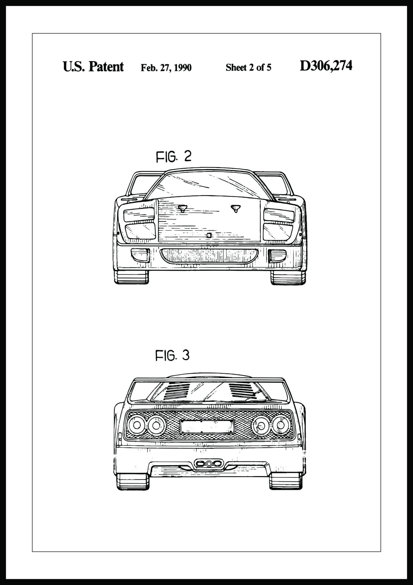 Patenttegning - Ferrari F40 III - Poster trykkes i vårt eget printstudio på et 230 grams premiumpapir som er FSC-sertifisert og aldersbestandig. Vi har valgt den kraftige tykkelsen og matte overflaten siden det har en kvalitetsfølelse og gir et fint trykk uten refleksjoner.p>