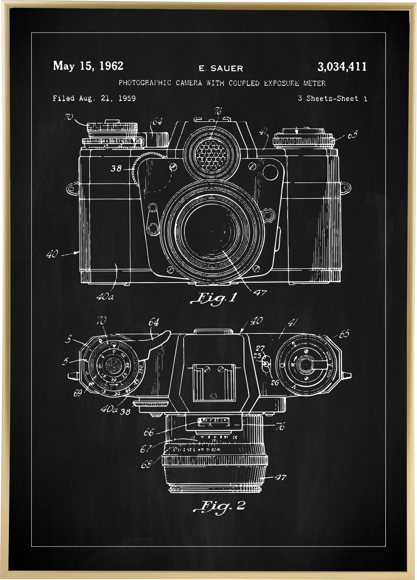 Lag en herlig retrofølelse i hjemmet eller på kontoret med denne eksklusive plakaten! Plakaten viser en patenttegning av et femtitallskamera, utformet av E. Sauer. Øverst ser du at tegningen ble levert inn 21.august 1959, at patentet gikk igjennom 15.mai 1962 og hvilket patentnummer det fikk. Kamera vises fra 2 ulike vinkler med noteringer ved hver del. Rundt motivet er det en tynn linje. Ettersom plakaten finnes i flere ulike størrelser finner du enkelt en som passer for akkurat ditt formål. Kompletter gjerne med en fin ramme fra vårt store utvalg!