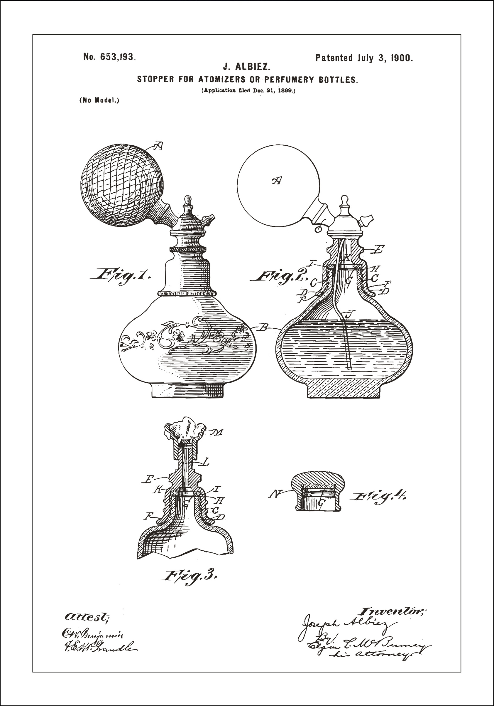 https://www.bgafotobutikk.no/patentritning-parfymflaska-a-vit-151016789Patenttegning - Parfymeflaske A - Hvit Plakathttps://www.bgafotobutikk.no/resource/u1BH/htg/pDH8XSlO9if/Affischer-Posters/Lorand_Coc/2017-04-21/Med_ram/Perfume_Bottle_Stopper_BW.jpg128.10NOKDiscontinued/Plakater/Plakater/NyheterHar du tenkt på hvor koselig det ser ut i Disneyfilmer når Minni Mus eller Dolly duck sprayer seg med parfyme old school med hjelp av en liten pumpe som sitter på parfymeflasken? Her har vi patenttegningen av en slik sjarmerende flaske, innlevert i USA i juli 1900! Velg mellom 3 fine farger og mange ulike størrelser.Bildverkstad21x29.7 cm (A4)21x29.7 cm2017-04-27T14:10:35+02:00