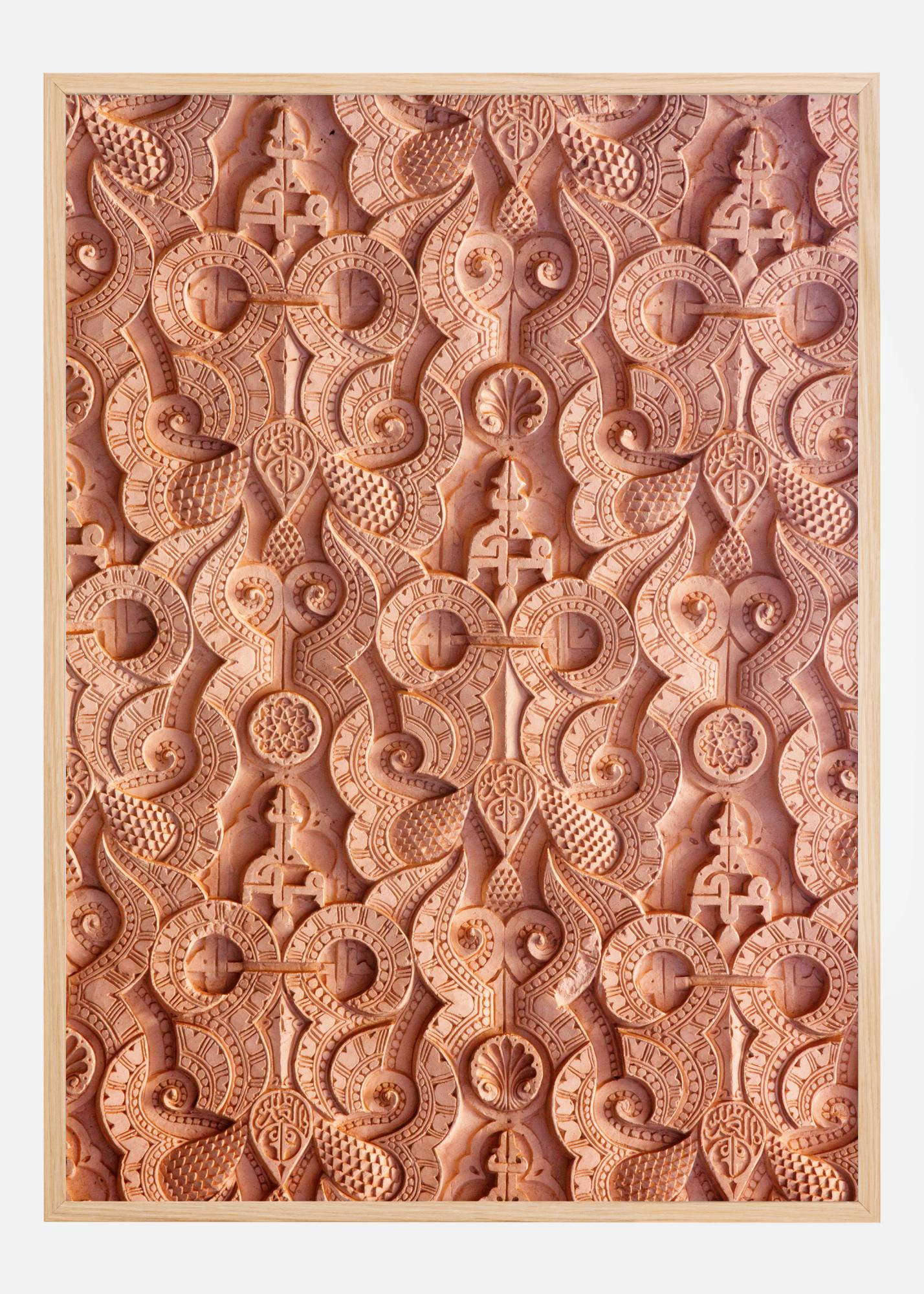 Fargene i motivet holder seg innenfor en palett av varme terrakotta og leire, noe som gir en naturlig og rustikk følelse til bildet. Det detaljerte mønsteret fremtrer godt mot den enhetlige bakgrunnen og skaper en tredimensjonal illusjon som er både tiltalende og dyp. Denne plakaten er perfekt for den som setter pris på kunst som fanger blikket og inviterer til nærmere studie, og som verdsetter håndverk og tradisjon i sin interiørstil.