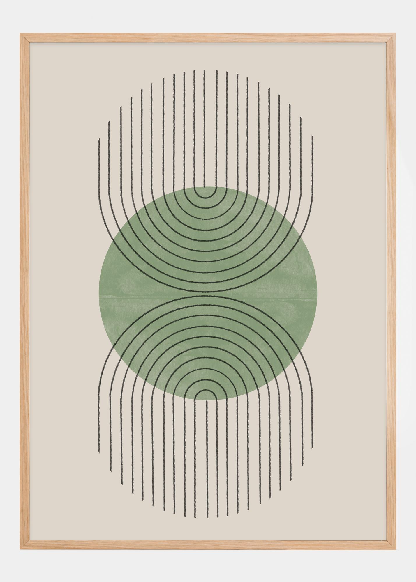 Denne plakaten er et minimalistisk kunstverk som fremhever en mettet grønn sirkulær form omgitt av en serie sorte linjer, noe som gir en følelse av rom og dybde. Den grønne nyansen i sirkelen varierer i intensitet, noe som skaper en visuell effekt av dimensjon og tekstur. Linjene, som strekker seg utover fra sirkelens kant, skaper en nesten hypnotisk effekt og forestiller en geometrisk harmoni.