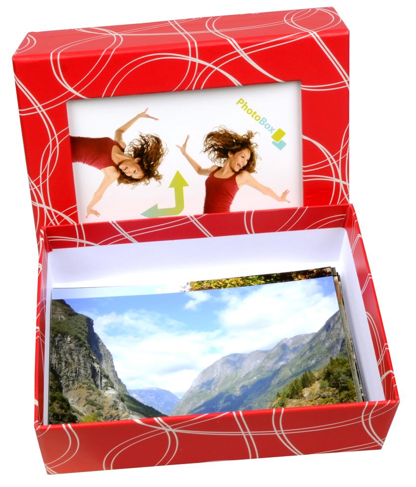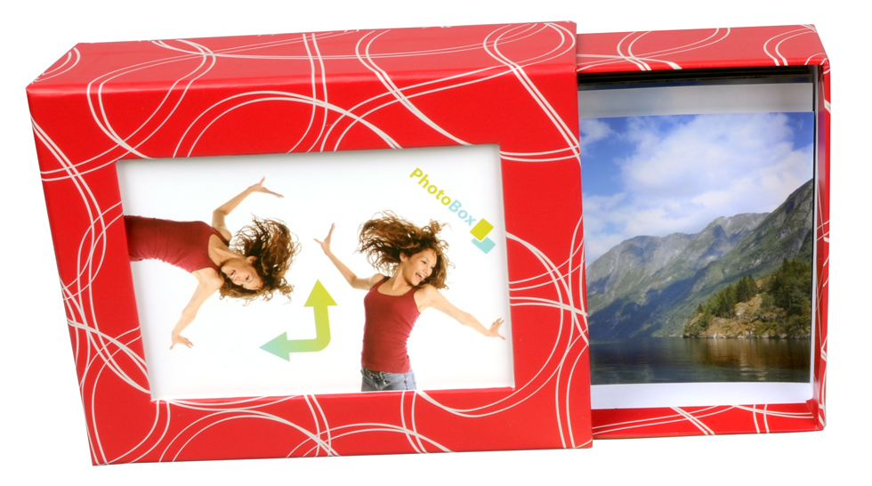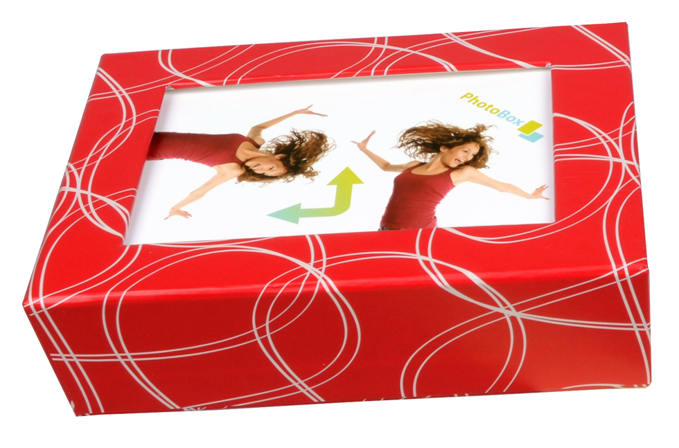 Trendig röd och vitmönstrad låda för fotoförvaring med plats för 120 bilder i formatet 10x15 cm eller 11x15 cm. På lådans ovansida finns plats för en egen bild i storleken 12x8,5 cm.