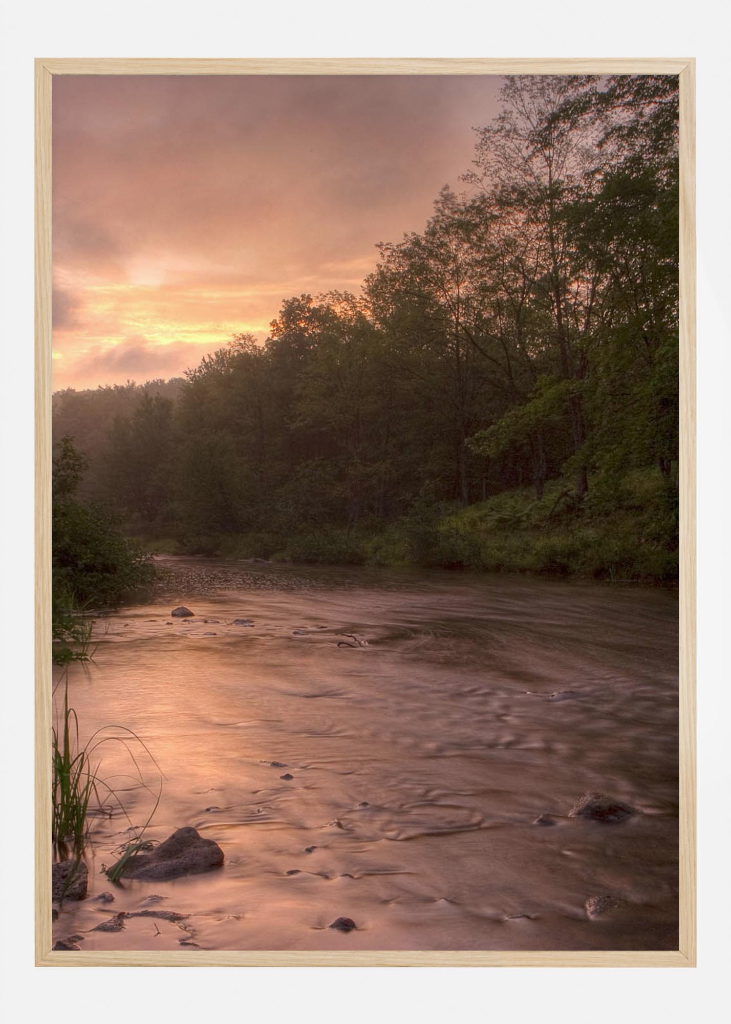 En fantastisk plakat av en gjørmete elvestrøm avgrenset av skog på begge sider. Kveldens oransje toner trenger seg gjennom skyene for å legge til et subtilt snev av oransje til scenen. Heng denne magiske plakaten i stuen og følg strømmen.