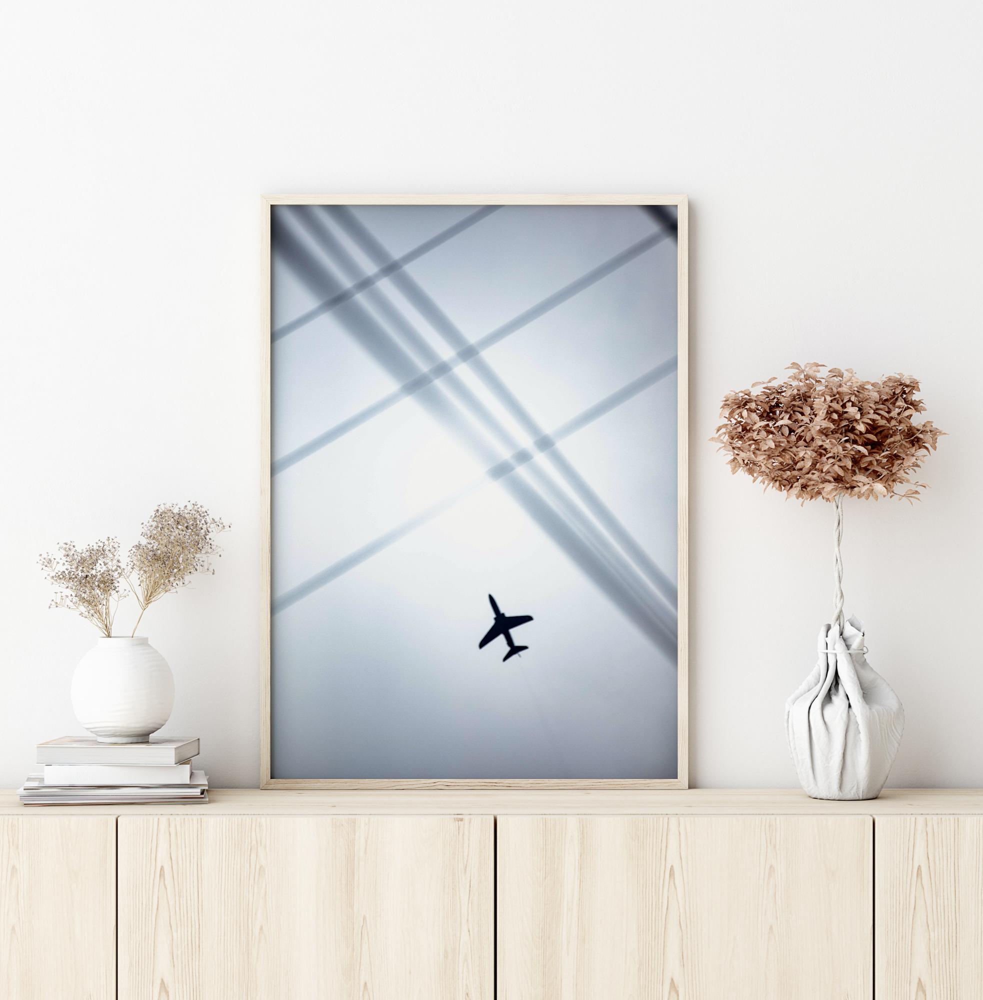 Et opp-ned-perspektiv på et flyvende fly. Det sterke sollyset fremhever flyet når det reiser mot en ukjent destinasjon. De svarte parallelle linjene legger til et snev av farge til plakaten. Gjett flyets endelige reisemål når du henger plakaten hjemme.