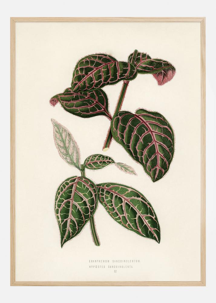 En herlig botanisk plakat med to grønne, bladrike stengler. Plassert på en beige bakgrunn, har hver stengel fire grønne og røde blader med hvite årer. De ytre linjene av stengelen fremheves med en delikat rød linje som skaper en varm atmosfære. En ideell plakat å henge i et botanisk miljø.
