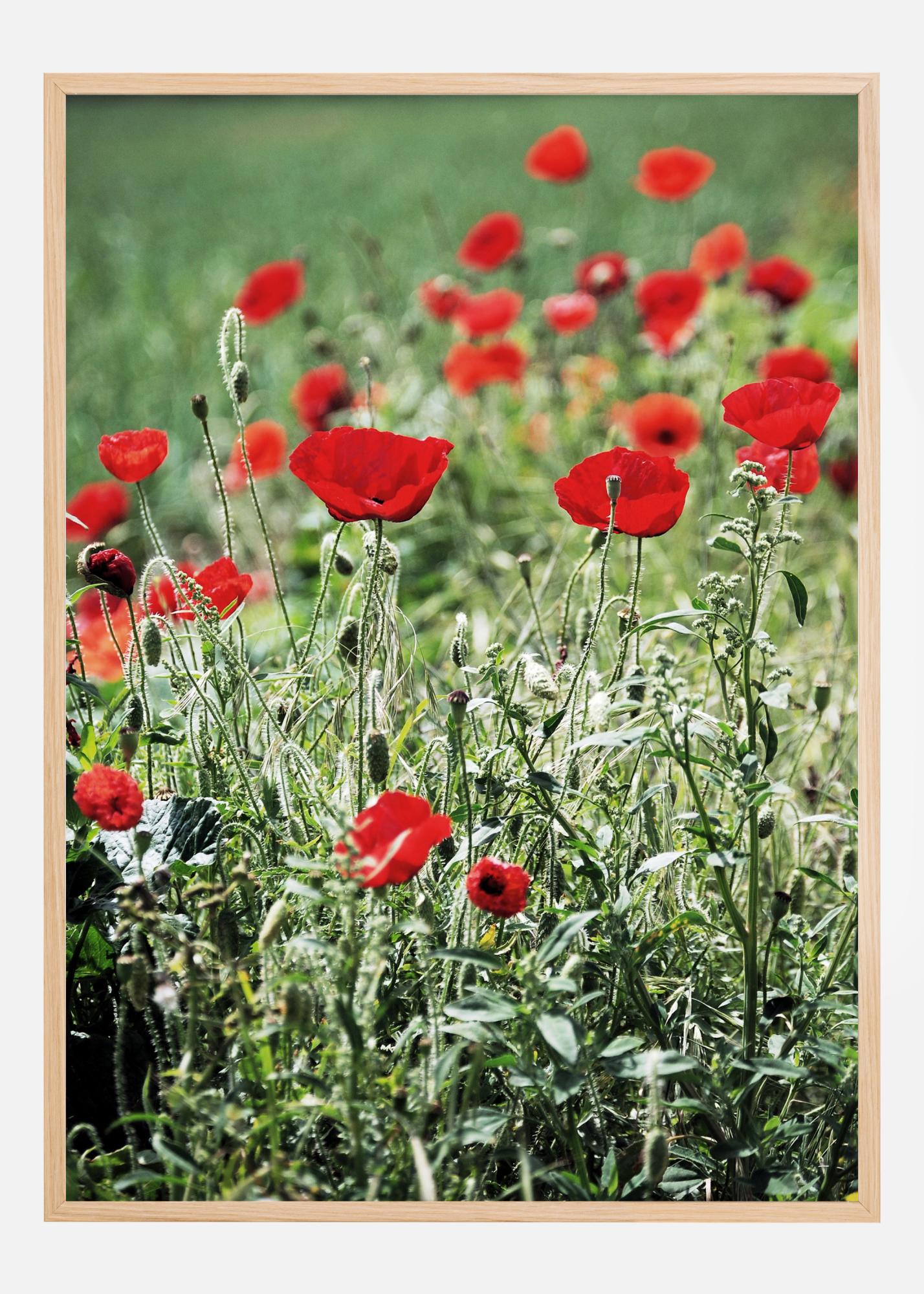 En vakker nærbildeplakat med en eng av valmuer. Det mørkegrønne gresset fremhever valmuenes sterke farger, og skaper frisk følelse. Valmuene står høye i engen mens gresset vokser høyt rundt dem. En avslappende og herlig plakat å henge på soverommet ditt.