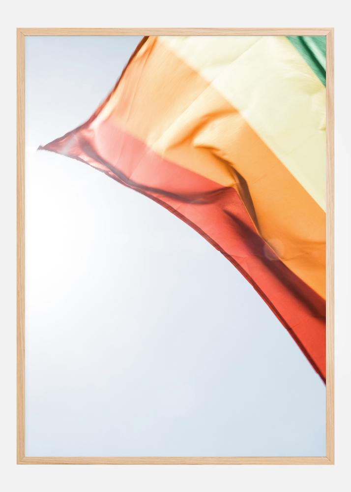 En symbolsk plakat med et flagg på en grå bakgrunn. Plassert i den øverste halvdelen av plakaten, blåser flagget forsiktig i vinden. De røde, oransje, gule og grønne stripene er ordnet horisontalt på flagget. En fargerik plakat som vil lyse opp dine bare vegger.