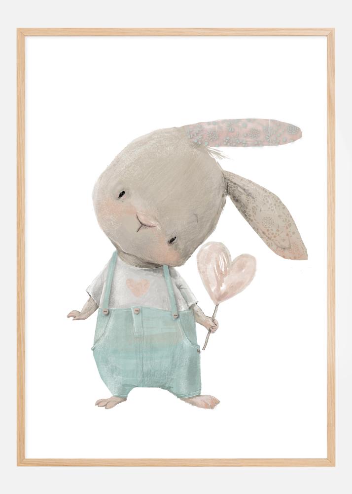 Denne bedårende posteren viser en liten kanin som holder en hjerteformet ballong, fremstilt med en finesse og følelse gjennom akvarellmaling. Kaninens milde, drømmende blikk og den fine detaljrikdommen i klærne dens, som inkluderer pastellfargede blomstermønstre, gir en følelse av uskyld og renhet. Denne illustrasjonen er en fortryllende hyllest til kjærlighet og omtanke, som fremkalles av den hjerteformede ballongen.