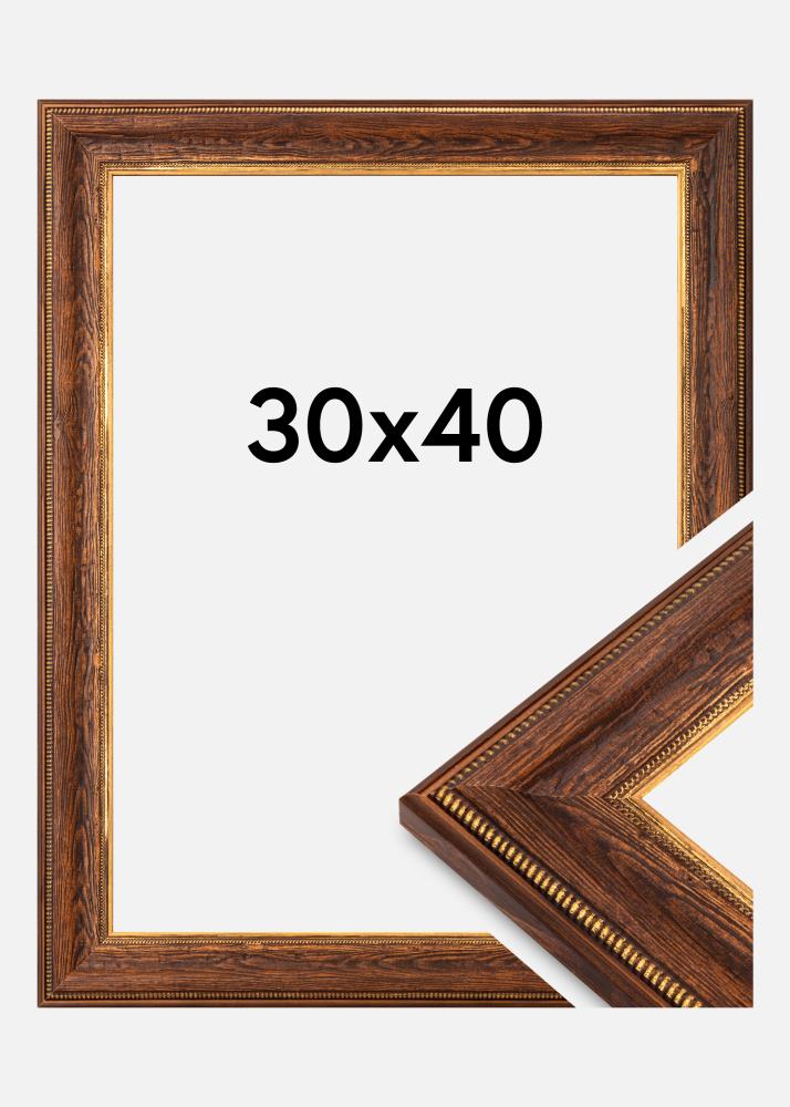 Denne elegante fotorammen i størrelsen 30x40 cm er en perfekt kombinasjon av rustikk sjarm og klassisk eleganse. Laget av høykvalitets tre, har rammen en dyp og varm brun farge som fremhever treets naturlige struktur. De dekorative gulldetaljene langs innerkanten gir et sofistikert preg, noe som gjør denne bilderammen ideell for tradisjonelle og vintageinspirerte interiører.