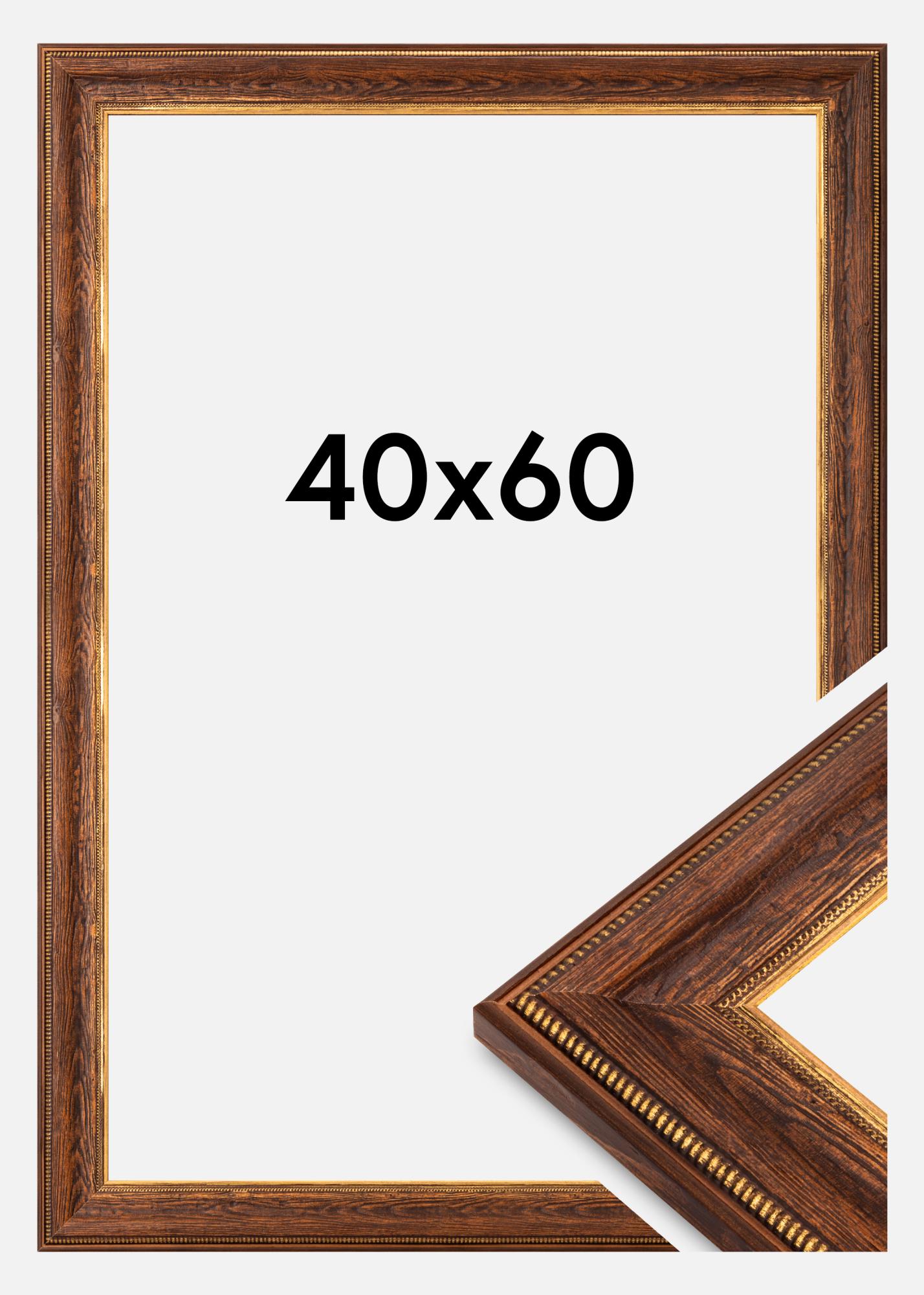 Denne elegante fotorammen i størrelsen 40x60 cm er en perfekt kombinasjon av rustikk sjarm og klassisk eleganse. Laget av høy kvalitet tre, har rammen en dyp og varm brun farge som fremhever treets naturlige strukturer. De dekorative gulldetaljene langs innerkanten gir en sofistikert touch som kompletterer både tradisjonelle og vintageinspirerte interiører.