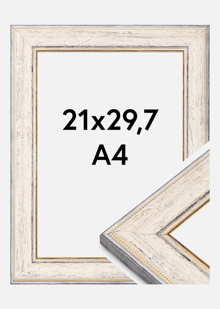 Denne vakre bilderammen i størrelsen 21x29,7 cm (A4) er en perfekt kombinasjon av vintageinspirert design og moderne funksjonalitet. Med sin rustikke hvite og grå trefinish, komplettert av subtile gulldetaljer langs innerkanten, tilbyr denne rammen et sjarmerende aldrende utseende. Den profilerte designen og den tydelige trestrukturen gjør den til et utmerket valg for landlige, shabby chic- eller klassiske interiørstiler.