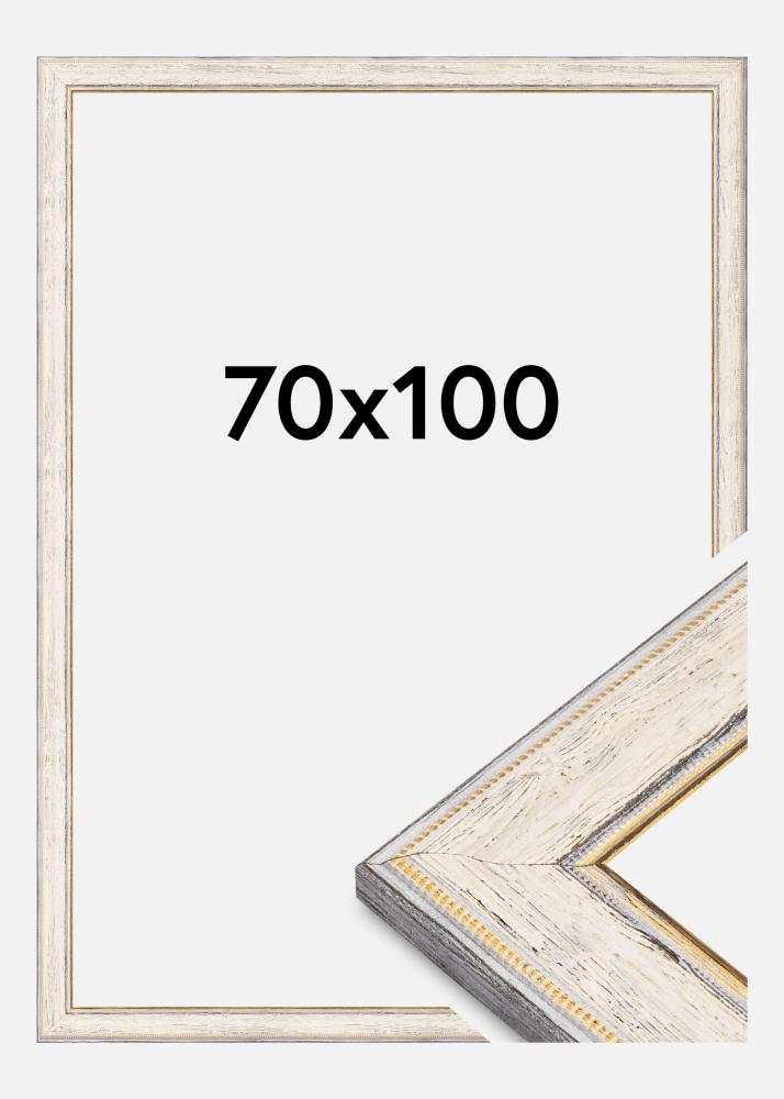 Denne vakre fotorammen er en perfekt kombinasjon av vintageinspirasjon og moderne eleganse. Med sin rustikke hvite og grå trefinish, komplettert av subtile gulldetaljer langs innerkanten, tilbyr den en sjarmerende aldringseffekt. Rammen er designet for å passe motiv i størrelsen 70x100 cm, noe som gjør den ideell for å fremheve dine favorittfotografier eller kunstverk med en tidløs og sofistikert følelse.