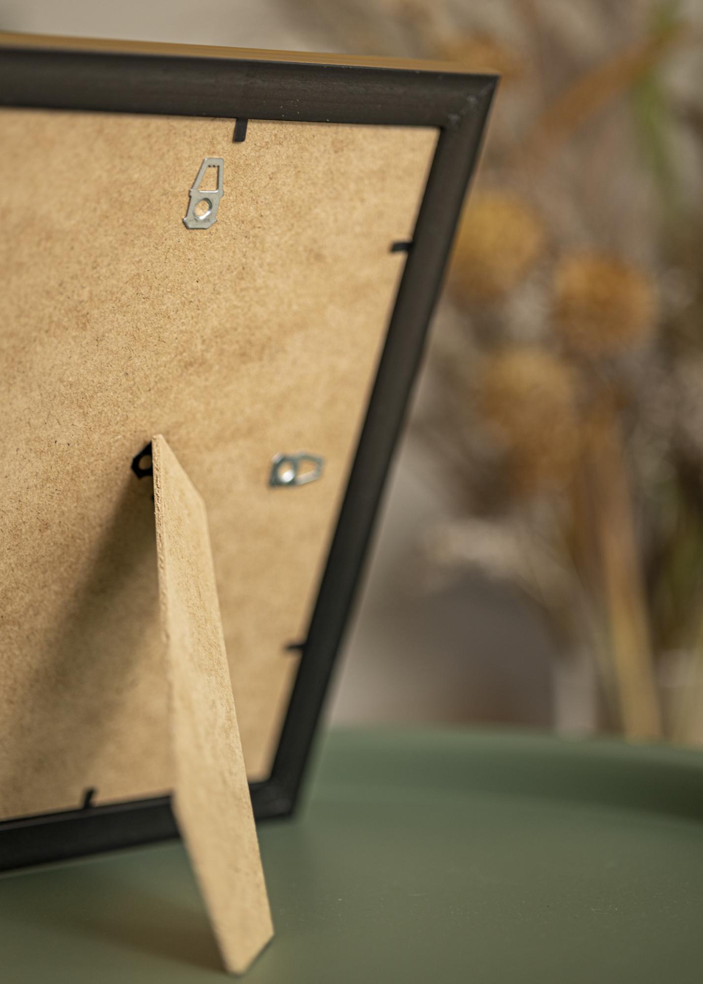 Denne bilderammen er perfekt når du leter etter innramming som er både elegant, robust og lett – den har nemlig akrylglass, som er uknuselig og veier lite. For å hindre at det er riper ved levering, leveres rammen med en beskyttende plastfilm på glasset. Du kan velge selv om du vil henge opp bildet loddrett eller vannrett, og det er veldig lett å sette inn bildet i rammen. Bare bøy opp stiftene på baksiden av rammen for å løsne bakplaten, og sett inn bildet i perfekt posisjon inntil glasset.
