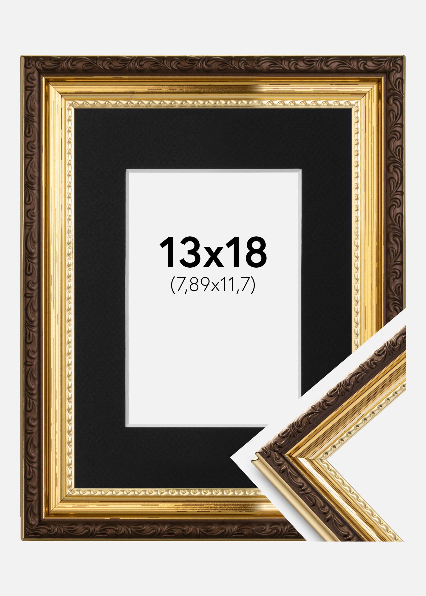 Pakke med bilderamme og passende svart passepartout. På produktbildet ser du rammens mål (skrevet med fet skrift) og passepartoutens innvendige mål (skrevet i parentes). Merk at passepartoutens innvendige mål alltid må være 1 cm mindre enn ønsket bildestørrelse.