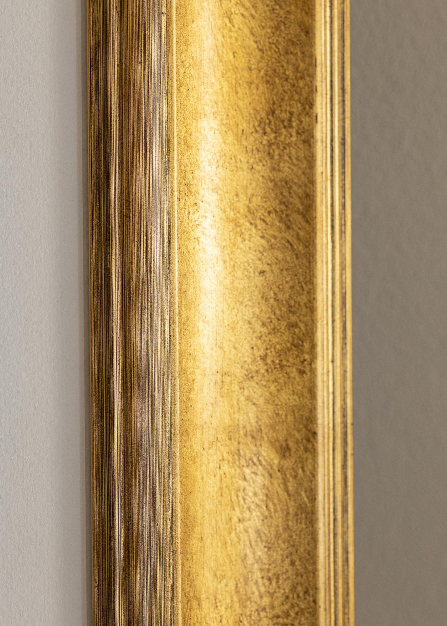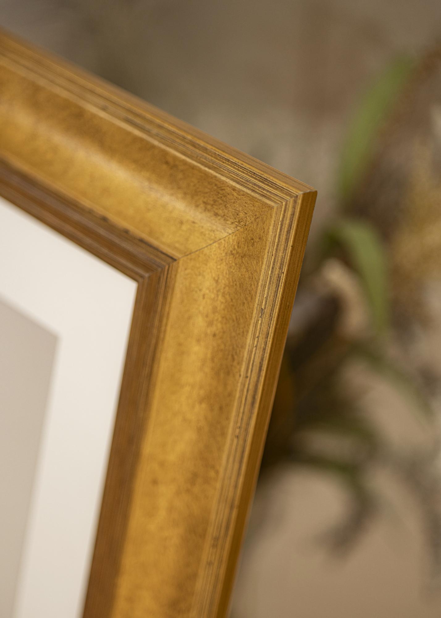 Rammen er laget av furu og har tynne linjer langs kantene som tilfører en sofistikert detaljrikdom. Den varme gulltonen gir en tidløs eleganse som passer perfekt i både moderne og tradisjonelle interiører. Ettersom hver bilderamme blir laget på bestilling i vårt eget rammeverksted, kan du være sikker på å få et produkt som er skreddersydd etter dine spesifikke behov.
