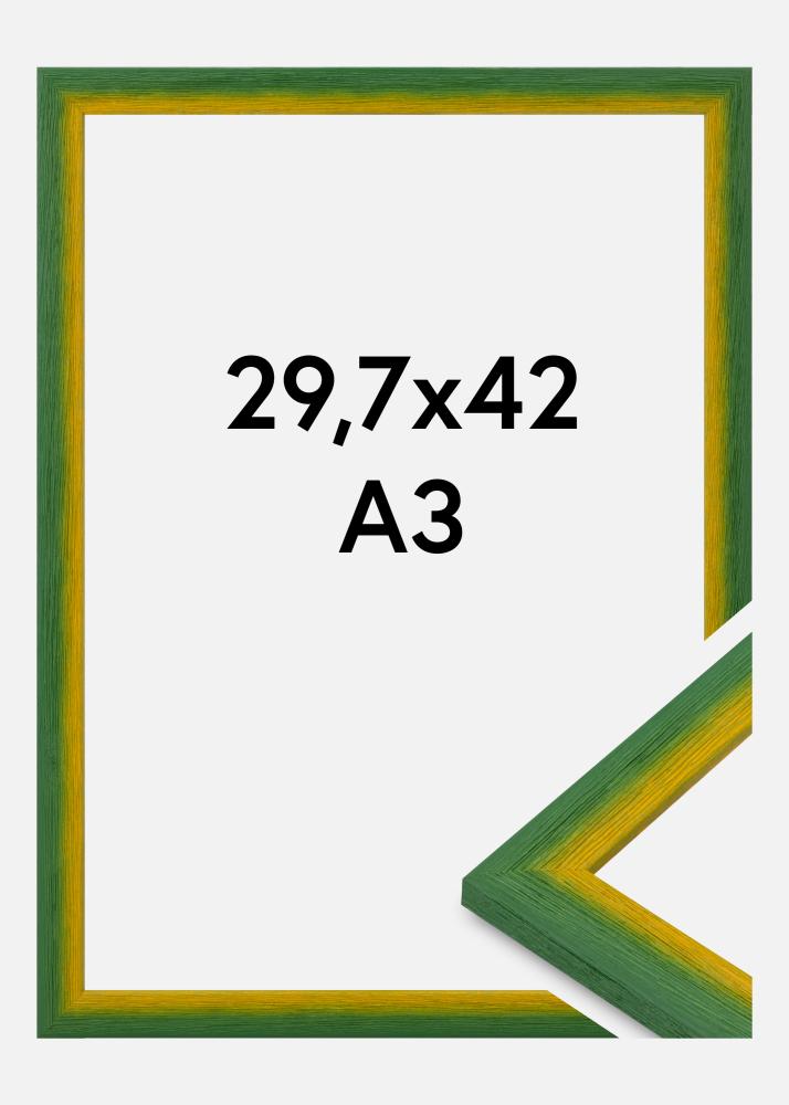 Denne fotorammen i størrelsen 29,7x42 cm er en perfekt kombinasjon av moderne design og naturlig skjønnhet. Med sin glatte overflate og harmoniske blanding av grønne og gyllengule toner, fremhever den treets naturlige struktur på en elegant måte. Den smale profilen, med en ramme list på 23 mm og en dybde på 13 mm, gir et stilrent og minimalistisk uttrykk som lar motivet ditt stå i sentrum.