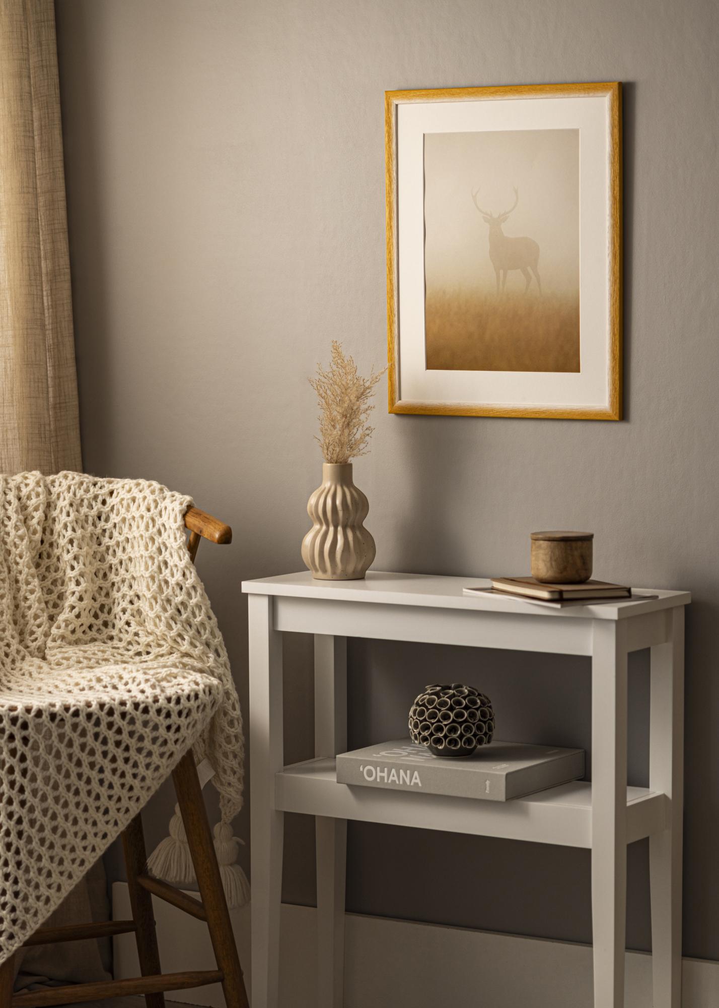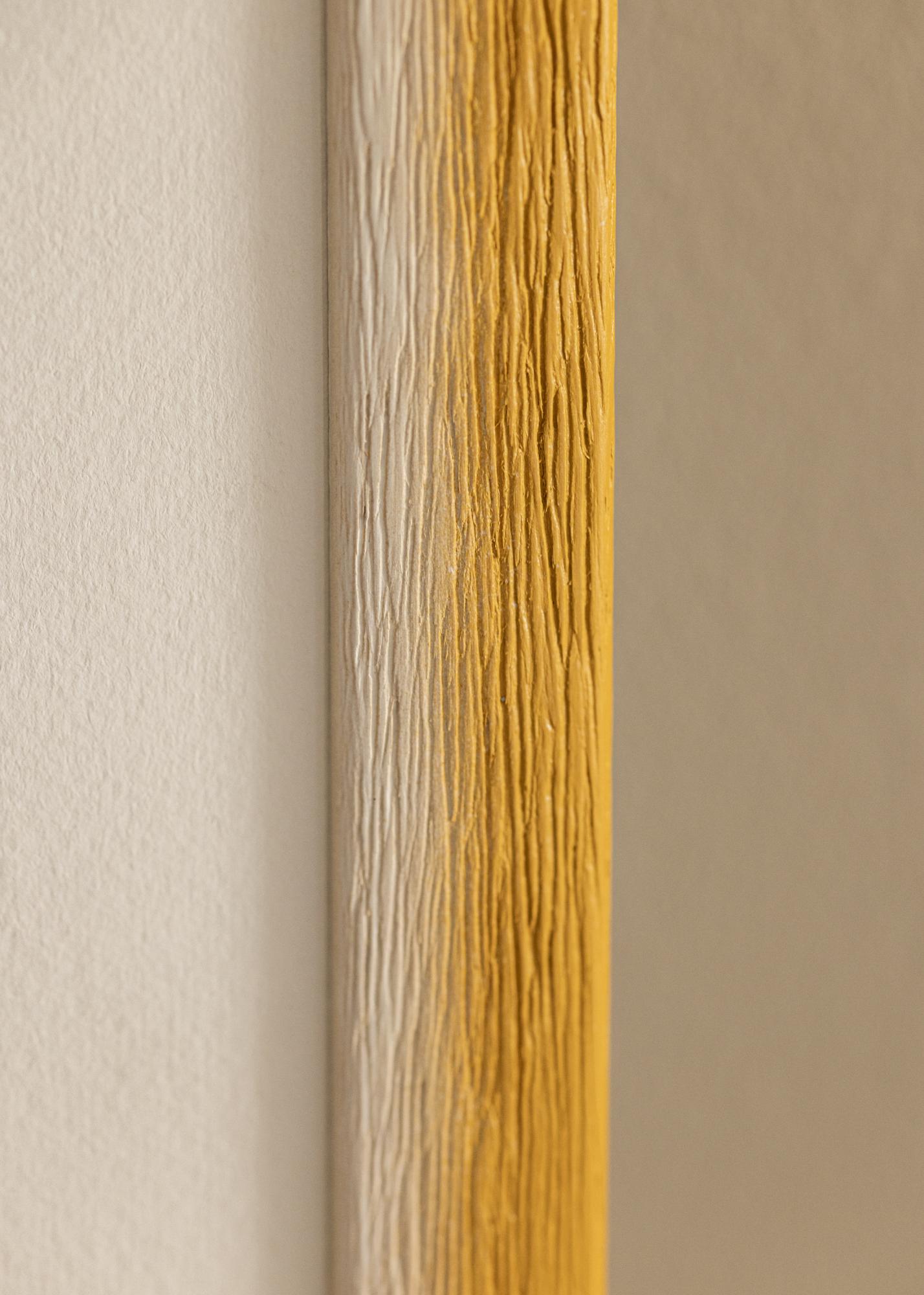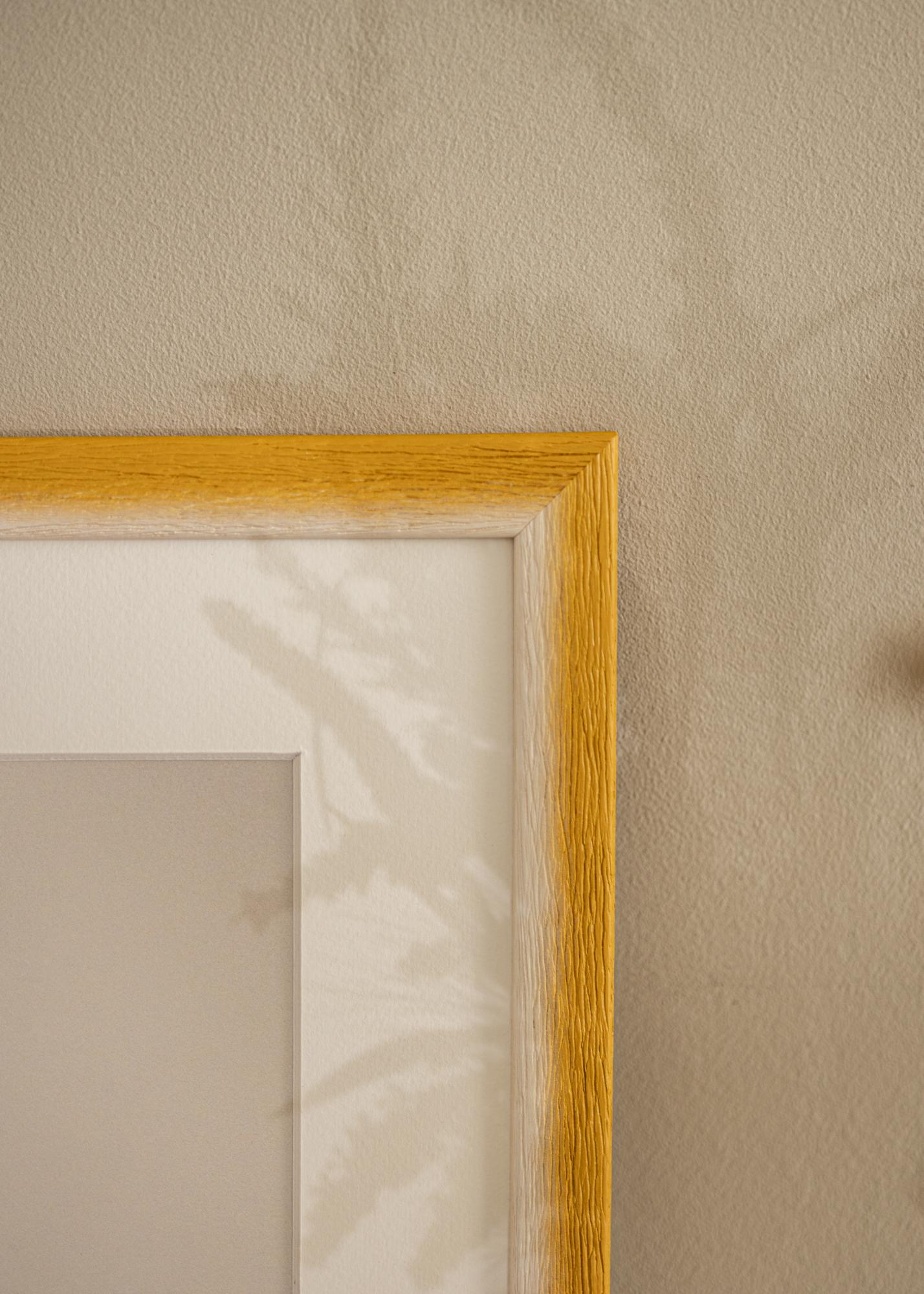 Denne bilderammen har en harmonisk fargeovergang fra en lys, naturhvit tone til en varm okergul nyanse. Overflaten er preget av en tydelig trestruktur med dype årer, som gir en taktil og naturlig følelse. Den subtile overgangen mellom fargene skaper et mykt, malt uttrykk med en levende dybde som forsterker hvert bilde.