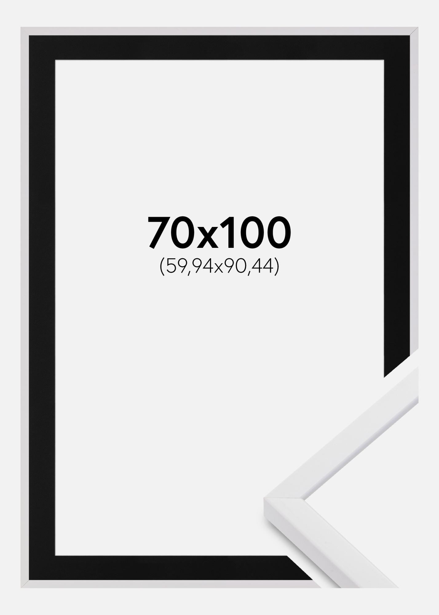 Pakke med bilderamme og passende svart passepartout. På produktbildet ser du rammens mål (skrevet med fet skrift) og passepartoutens innvendige mål (skrevet i parentes). Merk at passepartoutens innvendige mål alltid må være 1 cm mindre enn ønsket bildestørrelse.