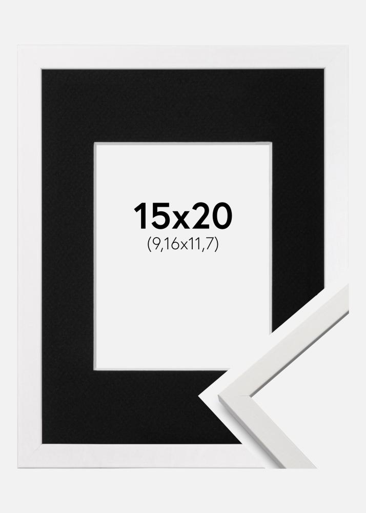 Pakke med bilderamme og passende svart passepartout. På produktbildet ser du rammens mål (skrevet med fet skrift) og passepartoutens innvendige mål (skrevet i parentes). Merk at passepartoutens innvendige mål alltid må være 1 cm mindre enn ønsket bildestørrelse.